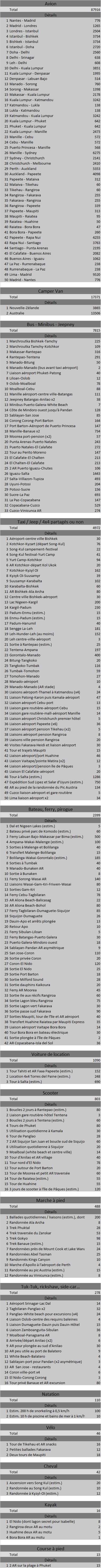 Nous ne sommes pas vraiment en mesure de donner une évaluation précise du budget réel de notre voyage, mais nous pensons qu'il se situe dans un intervalle d'erreur inférieur à 10% par rapport à nos prévisions d'avant le départ, soit vraisemblablement entre 24000 et 27000 euros par personne. En revanche, j'ai pu calculer, à tête reposée et en reprenant les données accumulées pendant le voyage, quelques chiffres évocateurs permettant de donner une idée de l'extension quantitative de notre parcours. Certes, cette démarche a quelque chose non seulement d'un peu inutile, mais aussi de contradictoire par rapport à certaines critiques évoquées dans mon bilan général. Mais bon: la dérive quantitativiste, si elle constitue l'une des caractéristiques les plus évidentes du monde libéral stupidement utilitaire qui est le nôtre (avec son obsession pour les normes, les capacités techniques et les prix), correspond aussi chez moi à un tropisme naturel, visible dès l'enfance au travers de ces heures passées à jeter des dés sur le plancher de ma chambre pour en noter scrupuleusement la valeur, sur des pages entières de blocs-notes à petits carreaux.