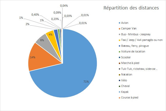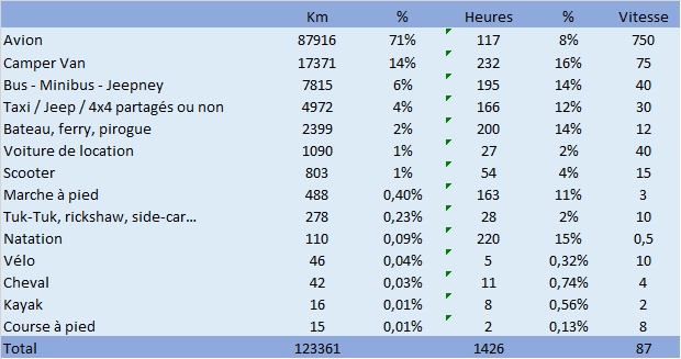 La vision chiffrée de notre voyage nous apprend d'ailleurs un certain nombre de choses inattendues à son propos: par exemple le fait que notre tour du monde a été exceptionnellement long (en distance parcourue). A notre retour, j'avais le sentiment diffus que nous avions parcouru une distance totale égale, non pas à une fois de tour de la terre (le minimum pour passer par les antipodes), mais au moins deux fois cela. Il a fallu attendre près de dix mois après la fin de notre voyage pour réaliser que la réalité était encore supérieure. En fait, nous avons parcouru à peu près 3,08 fois le tour de la terre (plus de 123000 kilomètres, pas de quoi se vanter du point de vue du bilan carbone) en avion, bateau, tuk-tuk, à cheval et en scooter... C'est beaucoup, et en tout cas nettement plus que la moyenne des tourdemondistes, qui s'établit plutôt autour de 83000 kilomètres, si j'en crois les huit premiers bilans chiffrés mentionnant cette valeur que j'ai trouvés sur le web (respectivement 51000, 54000, 75000, 105000, 95000, 80000, 105000 et 105000). En fait, par rapport à la moyenne, on a tout simplement fait... l'équivalent d'un tour du monde de plus! Pas étonnant dans ces conditions que nous ayons fini l'expérience un peu fatigués par l'épreuve... Mme Roquigny, notre vieille voisine de Canouville malheureusement disparue pendant notre voyage, nous avait prévenus qu'elle pensait que nous n'arriverions pas à boucler notre parcours; elle estimait que le tour du monde était impossible à réaliser parce que trop long, trop dangereux, trop difficile: qu'aurait-elle songé si elle avait appris qu'au final, nous triplerions la mise?