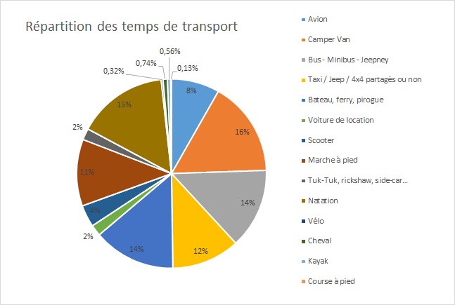 16%: Proportion du moyen de transport principal (le camper van de location) dans l'ensemble, en temps passé dans les transports (erreur estimée inférieure à 25%). Le détail est donné ici