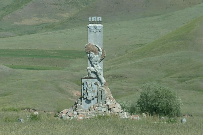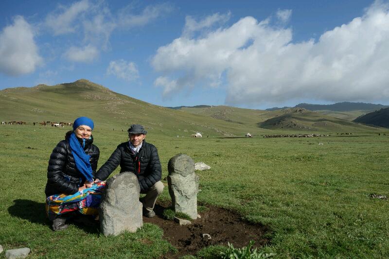 Il y a systématiquement une salade de tomates/concombres à tous les repas. Nous avons ce matin, en plus, du porridge, un gâteau (je mange celui d’Aman car il n’aime pas), un reste de pâtisserie d’hier, des nans et de la confiture. Aman nous conduit après le petit déjeuner à deux pierres tombales. Il s’agit de stèles très anciennes dont la signification n’est pas bien connue, mais qui serait un indice d’un peuplement très ancien par des populations d’origine mongole.