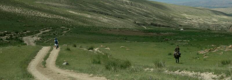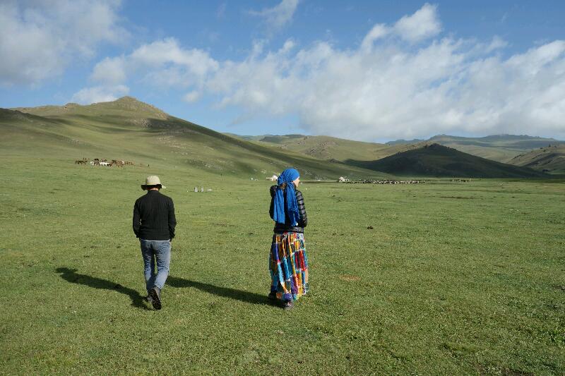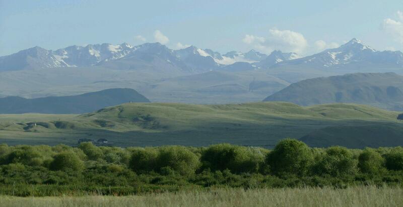 Les paysages sont « alpins », de chaque côté de la vallée parsemée de buissons et de cours d’eau, les montagnes, dépourvues de végétation, bordent la longue route qui file vers l’horizon et les sommets enneigés pointent ci et là. Au bord de la route, des yourtes ont pris place. C’est là que les fermiers viennent passer l’été avec leurs bêtes. Chacun vend du koumis en bouteille en plastique recyclée et des kourouts, fromages de vache secs en forme de boulettes sur les étals longeant la route…