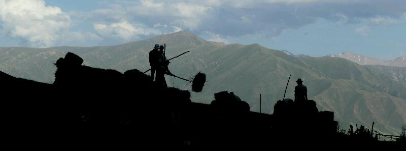 L’heure du bilan au sujet du Kirghizistan est donc venue; et on ne peut pas dire que la destination nous ait surpris de manière extrême, par rapport à ce que j’en attendais et qu’Isabelle a pu commencer à en imaginer à partir du moment où elle a appris que nous nous trouvions dans une sorte de petite Mongolie. Au-delà de l’extrême isolement linguistique dont j’ai déjà parlé, et pour formuler les choses de manière synthétique, je dirais tout de même que ce pays nous a permis de prendre conscience que l’Asie existe; je veux dire, une Asie qui ne se réduit ni aux charmes de l’extrême-Orient, ni aux affres du proche-Orient, ni à la domination économique de la Chine. Une Asie qui mérite pleinement son nom d’Asie Centrale, ethniquement sino-mongole, culturellement nomade (on trouve là les descendants des Huns), et politiquement russe. Sur le plan religieux, le pays n’est pas bien cernable. Notre guide de Kochkor, Amaan(tur), qui venait de terminer des études d’anthropologie, nous a parlé d’un certain clivage (peu apparent pour nous) entre le nord, plus animiste, et le sud, plus musulman. Nous n’avons pas assez parcouru le pays pour confirmer ce point. Partout, nous avons vu des femmes dans l’ensemble peu voilées, des mosquées plutôt jolies, de larges cimetières sur les tombes desquelles figurent de belles gravures des défunts, et une vie de ville ou de village qui ne semblait que peu affectée par la religion. Apparemment, le pays est plutôt en voie de développement économique, et les infrastructures (téléphonie mobile, routes, électricité) progressent bien. On retrouve comme partout une opposition assez forte entre le monde des villes, plus affairé et plus artificiel, et le monde des villages, toujours très agricole et authentique.