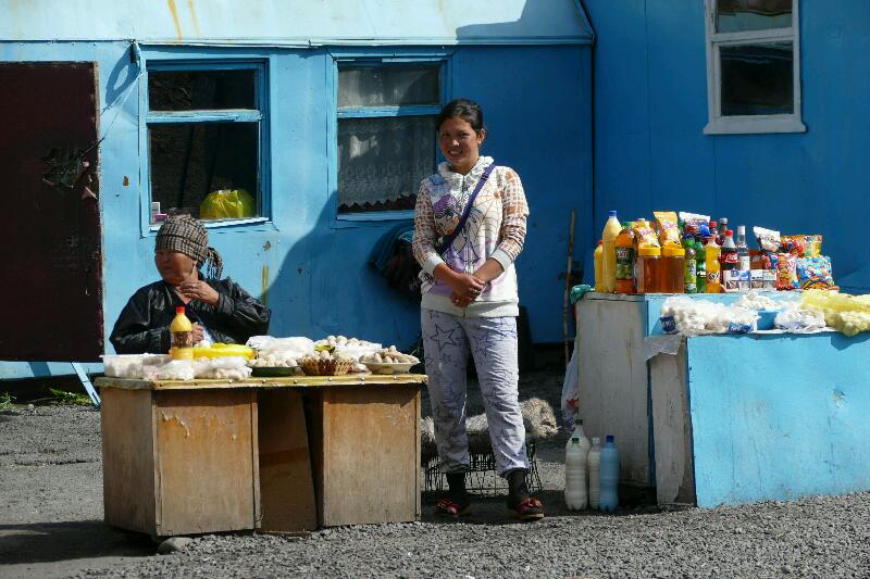 Réveil anticipé à 6h30 à cause de Manu qui s’est trompé d’heure … On se rendort plus ou moins 1 heure. Entre le petit déjeuner (pendant lequel nous échangeons avec un jeune couple de backpackers) et le départ pour Köl-Ükök à 9h00, Manu achète un naan frais et cherche à re-créditer (non sans mal) son téléphone. Il s’avère en effet qu’aucune boutique à l’enseigne Mégacom ne délivre de crédit Mégacom !