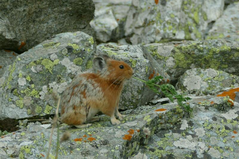 Manu me rejoint et nous apercevons un adorable petit animal dans les rochers. On se met à l’affût et on attend qu’il daigne ressortir, ce qu’il ne manque pas de faire, au bout d’un certain temps. Un pika : c’est comme un lapin mais avec des oreilles et des pattes postérieures réduites. La plupart des pikas utilisent les tas de pierres comme abri contre les intempéries et les prédateurs, donc rien d’étonnant à en trouver un là.