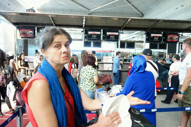 Le réveil sonne à 3h45. Voir l’hôtel aussi calme me fait une drôle d’impression. Nous regagnons le taxi (que nous partageons avec David et Nino) à 4h00, dans une chaleur lourde et naissante malgré l’heure matinale. L’enregistrement a été vraiment pénible. Les files d’attente étaient complètement bloquées. La nôtre pour un problème informatique. Après un tour très rapide dans l’aéroport, nous confirmons que c’est le premier pays sans carte postale que nous visitons. Nous aurions aimé en écrire aux deux personnes sans connexion internet : Denise et Mme Roquigny. Au contrôle de police, une employée m’ordonne de laisser mes flacons qui doivent obligatoirement passer en soute. Ce sont pourtant des contenants autorisés à passer en cabine ! Manu me dit de faire comme si je n’avais pas compris et de les remettre dans mon sac. Je m’exécute bien qu’elle me surveille sans cesse du coin de l’œil. Quand nous quittons la salle, nous l’entendons râler alors nous partons vite nous perdre dans la salle d’embarquement.