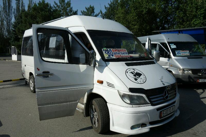 Il nous faut traverser un grand carrefour pour nous mettre sur la route de Kochkor. Les taxis essaient de nous décourager en nous disant qu’il n’y a pas de marshrutka qui va dans cette direction. Nous en trouvons une sans tarder !