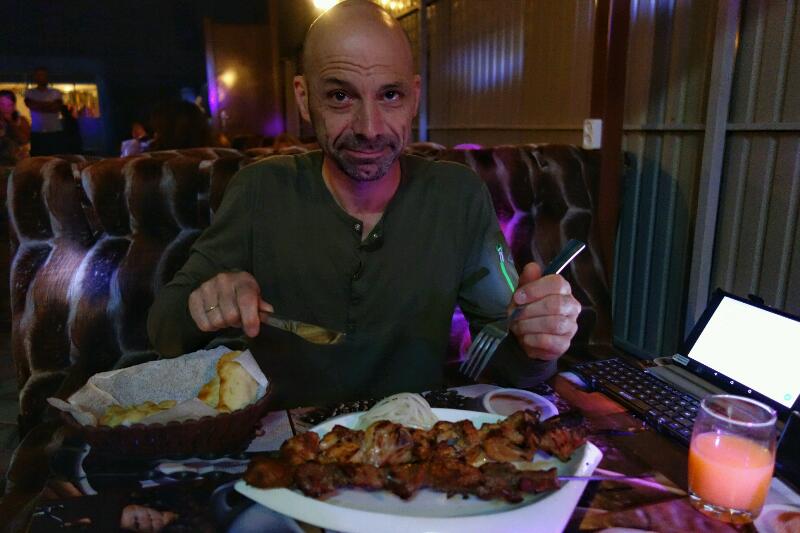 On se trempe chacun notre tour. Nous regagnons notre chambre avec la ferme idée d’aller dîner à l’extérieur ce soir. On nous apporte la carte en russe, avec aucune photo illustrant les plats. Grand moment de solitude … comment allons-nous faire ? On se débrouille, avec les gestes à commander quelque chose de facile à mimer : 2 brochettes !