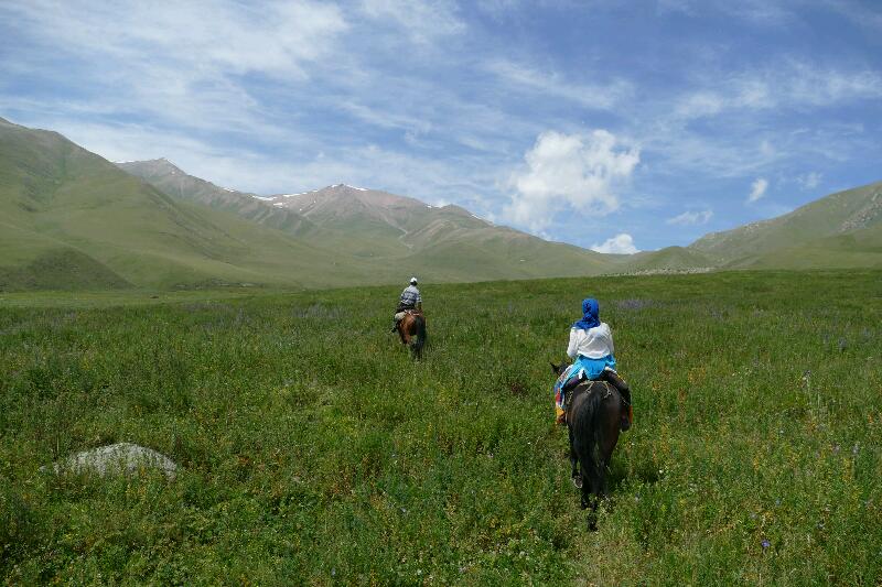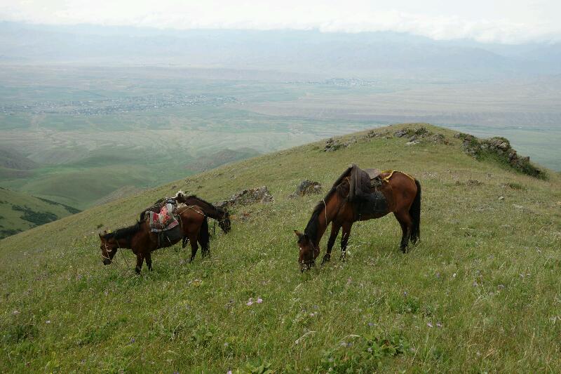 Aussitôt arrivés, Ainura a cherché à nous rabattre vers la proposition touristique de base, à savoir la montée à cheval en trois jours au Son Kul avec nuit en yourte avant le passage du col. L’affaire se compliquait un peu du fait de la tenue d’un grand festival de l’autre côté du lac seulement trois jours après notre arrivée à Kochkor. Du coup, mon plan initial, qui consistait à d’abord tester la résistance d’Isabelle (et surtout de sa hanche) sur une randonnée plus courte d’une ou deux journées tombait à l’eau. Bon; il faut savoir saisir les opportunités quand elles se présentent, et donc nous nous sommes lancés directement pour quatre jours au Son Kul commençant par deux de cheval, advienne que pourra… J’ai tout de même eu l’excellente présence d’esprit d’insister pour que nous passions par un autre col que le col habituel: celui que j’ai demandé, plus direct et plus raide, permet en effet d’atteindre la rive ouest du lac, plutôt que de passer par l’est plus fréquenté, ce qui s’est plus tard révélé crucial pour la réussite de notre séjour au Son Kul.