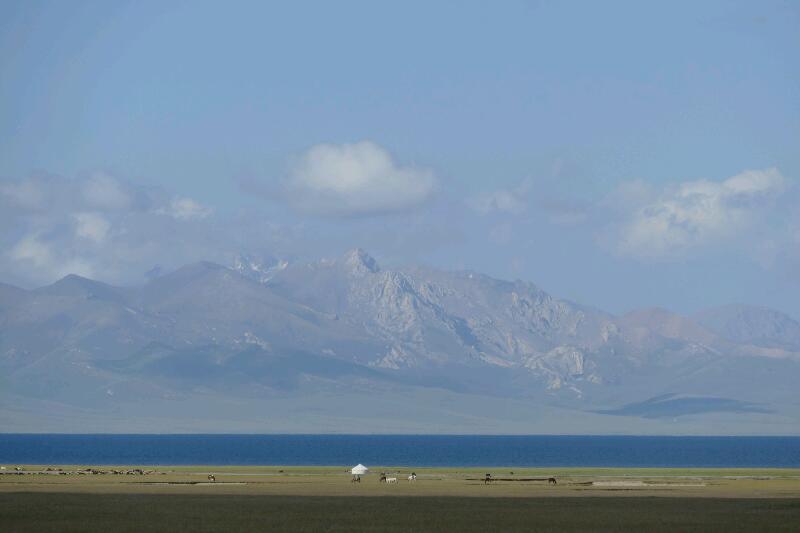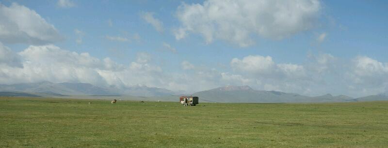 Nous ne sommes plus que tous les deux. Les nombreux touristes de ce camp sont partis tôt ce matin. Nous déjeunons dans la yourte à midi pour prendre la route tout de suite après. Nous quittons Song Kul avec un petit regret de ne pas avoir profité plus sous le soleil de cet endroit où règnent tranquillité et sentiment que chaque chose est à sa place…