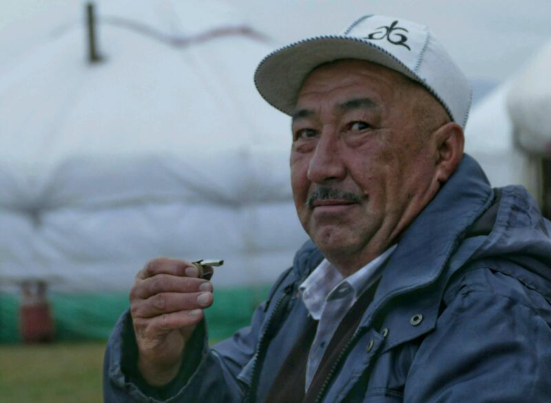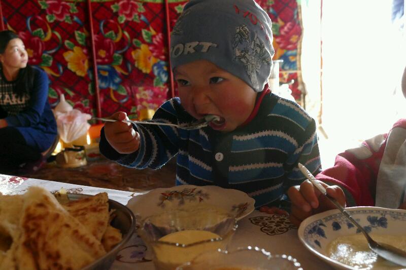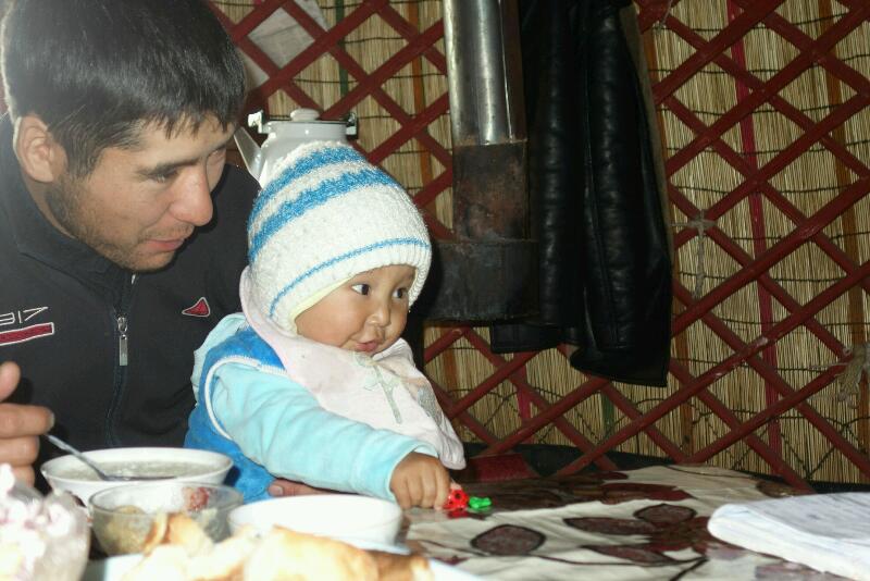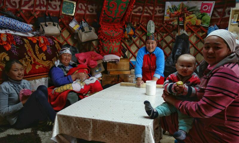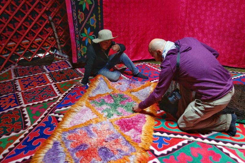 Une jeune femme s’approche et s’engage une discussion entre eux. Il lui demande à qu’elle clan elle appartient, question à laquelle elle demande à son enfant de répondre. En effet, une kirghize ne peut jamais prononcer le nom de son beau-père. Elle ne fait aucune difficulté à nous recevoir et nous invite à rentrer dans la yourte pendant qu’elle prépare le lunch. Aman est très impressionné. Il nous dit ne jamais être rentré dans une yourte d’une telle qualité. Il s’émerveille également devant les tapis.