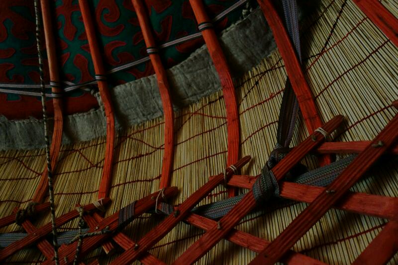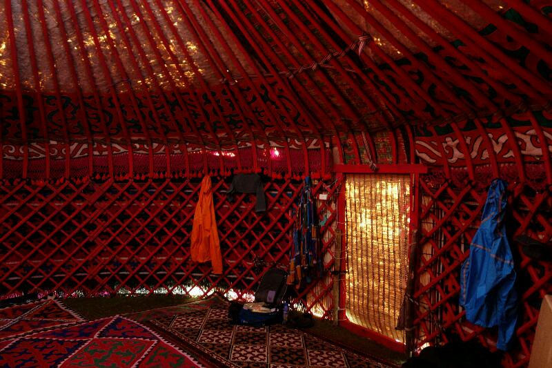 Nous sommes de nouveau logés dans une yourte kirghize traditionnelle. Petite pause concernant la construction de ces yourtes : l’armature posée au sol est un treillis pliable de bois de saule, circulaire, interrompu par le chambranle de la porte. Les lattes sont maintenues entre elles par des liens en nerfs. Ce treillis est peint en rouge, et reste apparent à l’intérieur, à la fois décoratif par ses losanges et utile pour accrocher vêtements, armes, jumelles, sacs brodés, et sacoches… "Kirghize" signifierait "rouge" et c'est la couleur de l’étendard de Manas, le héros légendaire de l'épopée nationale.