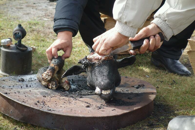 Nous avons l’immense chance de partager le quotidien des nomades pendant la matinée. Nous passons un grand moment avec trois enfants dans notre yourte. Ils demandent à jouer sur la tablette. On leur trouve un seul jeu mais cela nous permet de bien rire ensemble. Du coup, nous avons raté le dépeçage d’un mouton. Lorsque nous sortons de notre yourte, il n’y a plus que la peau qui gît par terre, le sang dans un récipient à côté, la tête et les pattes en train de griller et deux femmes en train de laver tripes et boyaux. On nous offre des petits morceaux grillés (un peu comme des lardons) et de la Vodka. Nous acceptons de goûter la viande bien qu’il me semble vraiment que les morceaux sortent directement de la tête …