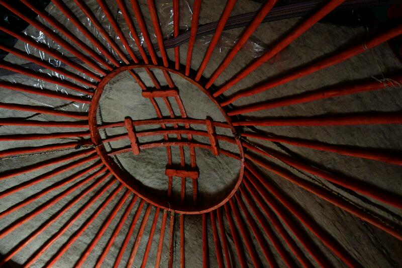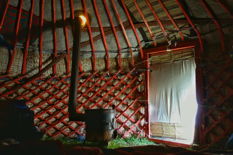 Sur cette armature, vont s’articuler les longues perches de la charpente dont l’amincissement et la courbure des bases rehaussent la paroi murale, arrondissant la liaison au toit, et offrent ainsi son élégance à la yourte kirghize. Au sommet les perches sont fixées sur un cercle de bois sculpté, qui est devenu l’emblème du pays, reconnaissable par deux séries perpendiculaires de trois sécantes. De longues sangles tissées maintiennent le tout comme des cordes. Une natte, colorée ou non, constitue la première couche, tout autour du treillis. Ces sangles et cette natte sont apparentes elles aussi de l’intérieur derrière les croisillons. L’armature est ensuite recouverte de plusieurs couches de feutre, enduit, ou protégé par une grosse toile tissée serré. Le sommet peut être fermé par un volet de feutre et de toile, ouvert ou rabattu à l’aide d’une corde maniée de l’extérieur. La porte orientée à l’est peut être à vantaux de bois, mais nous avons plus souvent vu un rouleau de feutre qui se coince par son seul poids en position ouverte, et fait rideau en position fermée. Ce rouleau est décoré de motifs géométriques traditionnels. Au sol, des tapis de feutre épais et des coussins colorés laissent le seuil à nu, là où vous vous déchausserez systématiquement. Vous pourrez rester en chaussettes. Au fond sont empilées les grosses couvertures, cachées par une tenture bariolée décorative, juste derrière la table basse rectangulaire, autour de laquelle chacun s’accroupit.