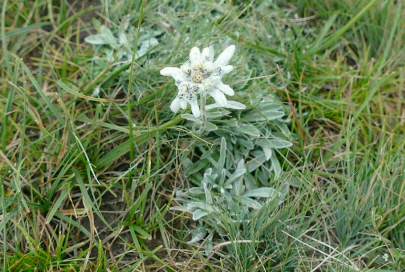 Ici, c’est le royaume des Édelweiss qui abondent en tapis argentés à tel point qu’on en écrase des centaines en marchant. Elles s’épanouissent ici sur des tiges de plus de 10 cm parfois!