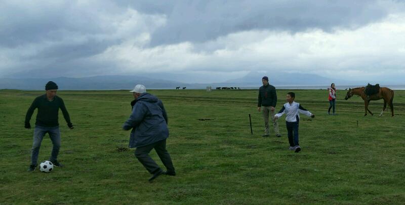 On sentait là une agitation inhabituelle liée à la proximité du festival, de nombreux kirghizes, famille éloignée, hôtes aidants (concept peu usuel en France, les “invités” payant leur passage en nature en participant aux tâches ménagères et agricoles), convergeaient vers la rive opposée du lac où devaient se tenir les festivités. Nous étions bien assez nombreux pour organiser un petit match de football sous le crachin, toutes générations confondues, dans une bonne ambiance et un air tout de même raréfié par l’altitude de plus de 3000 m. Altitude qui s’est rappelée à nous lors des premières nuits, d’abord sous la forme d’un froid glacial dès le soleil couché, puis sous la forme de manifestations légères de mal des montagnes (céphalées diffuses, insomnies à rallonge au milieu de la nuit malgré la fatigue accumulée).