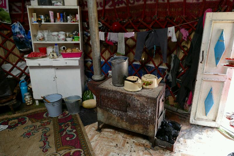 A droite, en entrant (c’est toujours comme ça), sont disposés le poêle dont le tuyau bénéficie d’une ouverture dans le toit avec un intervalle libre, puis le samovar ou la thermos, puis l’outre ou le tonneau à koumis, puis un petit buffet ouvert pour la vaisselle chinoise, et les couverts rangés dans un bocal.
