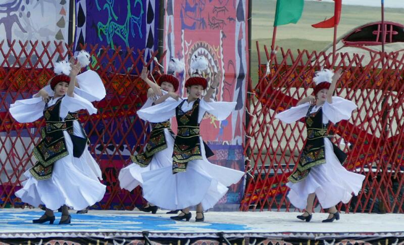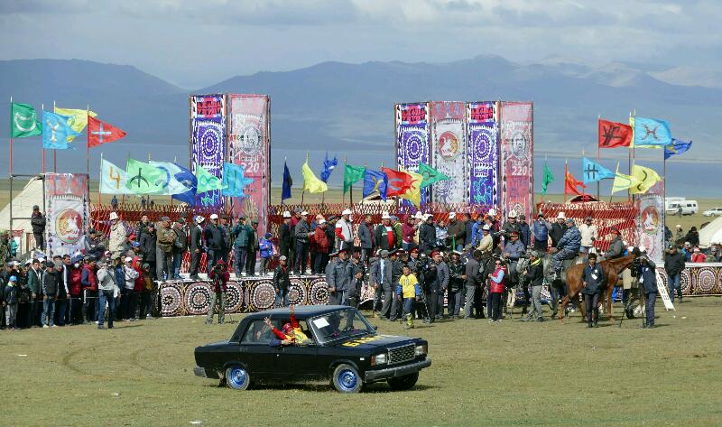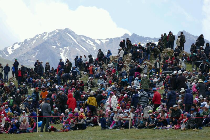 La première partie est consacrée, après le discours du premier ministre, à un show de variétés kirghizes. Nous nous régalons à photographier les magnifiques tenues traditionnelles ainsi que les visages, pointant frénétiquement notre appareil vers ce petit enfant, ou ce vieillard, en passant par les danseuses, l’éleveur de faucon (celle-ci, on l’a perdue) puis les différents numéros avec les chevaux. Nous espérons ramener des trésors dans nos boîtes à images.