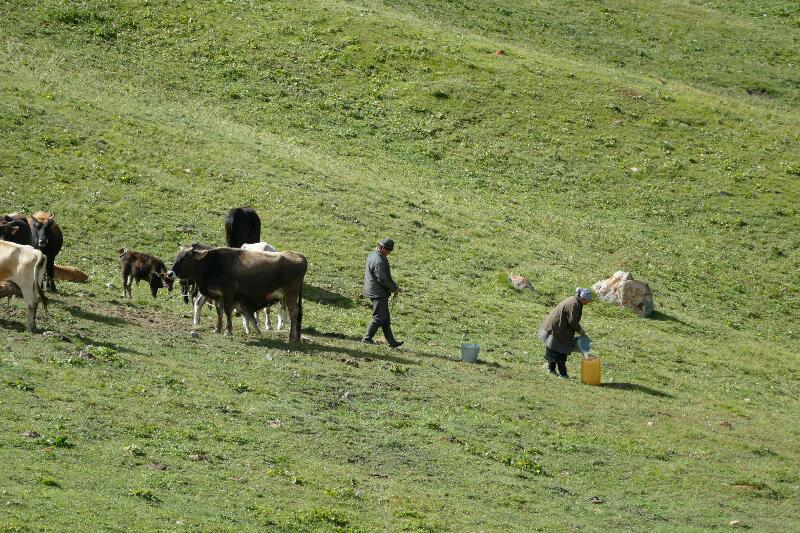 Narguiza nous apporte notre petit déjeuner à 8h00. Ce côté du lac n’est pas encore un lieu hautement touristique. La nature est préservée et les habitudes de vie aussi. C’est la vie dans les « jailoos » (pâturages de haute altitude).