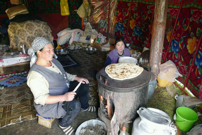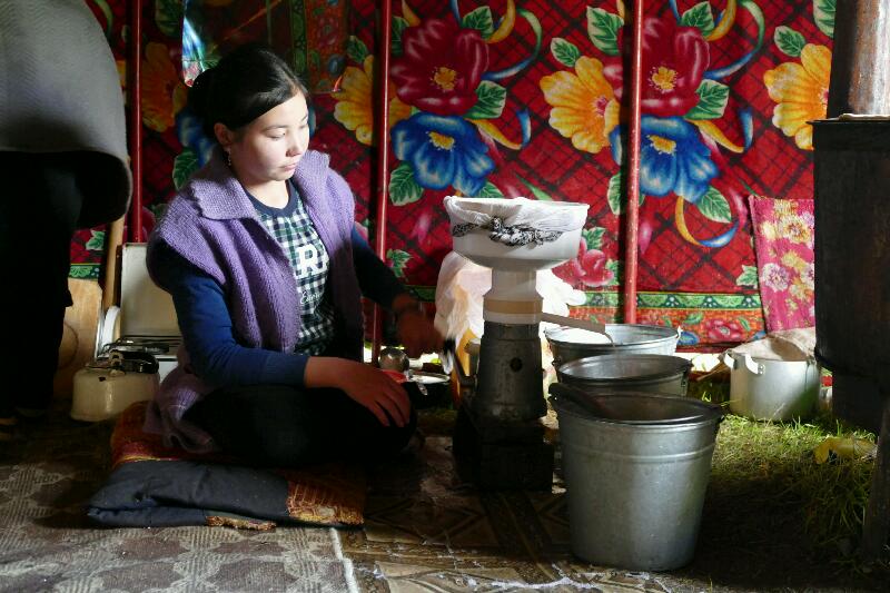 Dans la yourte familiale, sur le poêle, nourri de bouses sèches, la mère fait cuire des nans pendant que la fille aînée est en train de faire le barrattage (ce qui permet de transformer la crème de lait en beurre ...)