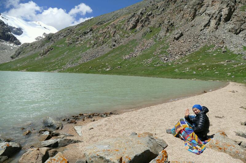 Après cette journée de transition, nous avons passé deux jours et demi (dont deux nuits en yourte d’altitude) aux lacs Kol Ukok et Kol Tor; Cette fois nous sommes partis à pied, d’une part parce que la randonnée équestre est de loin la source de coût la plus importante dans un voyage de ce type, et d’autre part parce que c’était là un moyen d’évaluer notre capacité de trekkeurs dans la perspective plus lointaine des expéditions dans l’Himalaya et les Andes. Assez peu documentés sur la randonnée en question, nous avons été un peu troublés de voir que presque tous les marcheurs (peu nombreux) rencontrés sur le chemin, et en particulier ceux avec lesquels nous avions partagé le taxi pour venir jusque là, étaient plus rapides et plus endurants que nous, ce qui a été l’occasion d’une assez grande remise en cause dès le premier soir… avant de rélaiser que la “grimpette” en question faisait tout de même 1000 mètres de dénivellé positif, et que peu nombreux étaient ceux qui, comme nous, enchaînaient dès le lendemain vers le lac glaciaire situé encore 400 mètres plus haut.