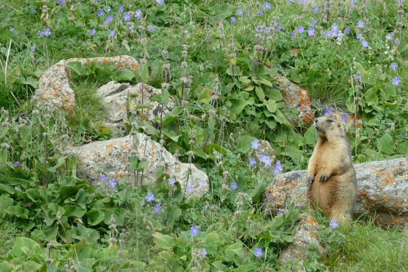 Nous partageons nos trois petites galettes achetées ce matin au Bistrot avant de partir. Manu a envie de monter un peu plus haut. Pendant sa grimpette, je peux profiter d’une grosse et grasse marmotte, installée comme un phoque, qui regarde les marcheurs, bien cachée. Je surveille Manu en même temps à la jumelle. Je ne sais pas ce qu’il va me ramener mais je le vois photographier quelque chose pendant de longues minutes.