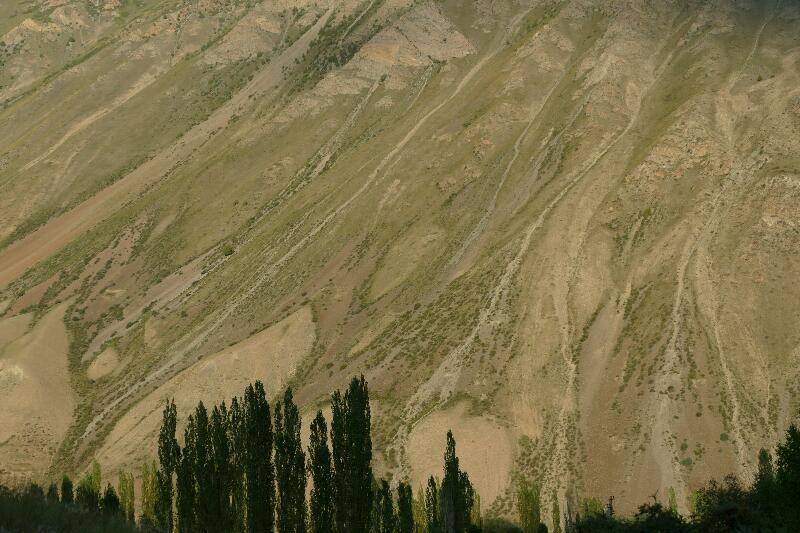 Dans ce village de Kyzyl Oï nous finirons par rester deux jours et trois nuits: l’occasion de croiser quelques routards égarés dans cette cuvette, dans l’attente d’un improbable lift au bord de la route (camion, tracteur, berline ou break locaux), et se résignant parfois à rester une nuit supplémentaire pour retenter leur chance le lendemain; l’occasion aussi d’une nouvelle randonnée équestre, champêtre et solaire, en compagnie d’Idriss, personnage sympathique et liant, quoique pas plus anglophone que les autres, que nous retrouverons le lendemain officiant comme arbitre de jeux équestres du village; l’occasion aussi de découvrir une autre face du Khirghizistan, souriante et rurale, s’organisant dans le cadre grandiose des parois de montagne striées d’ocres et rouges, autour des travaux agricoles, de la vie de village et du tracé parallèle de la rivière grondante et de la route menant d’un nulle part à un autre nulle part.