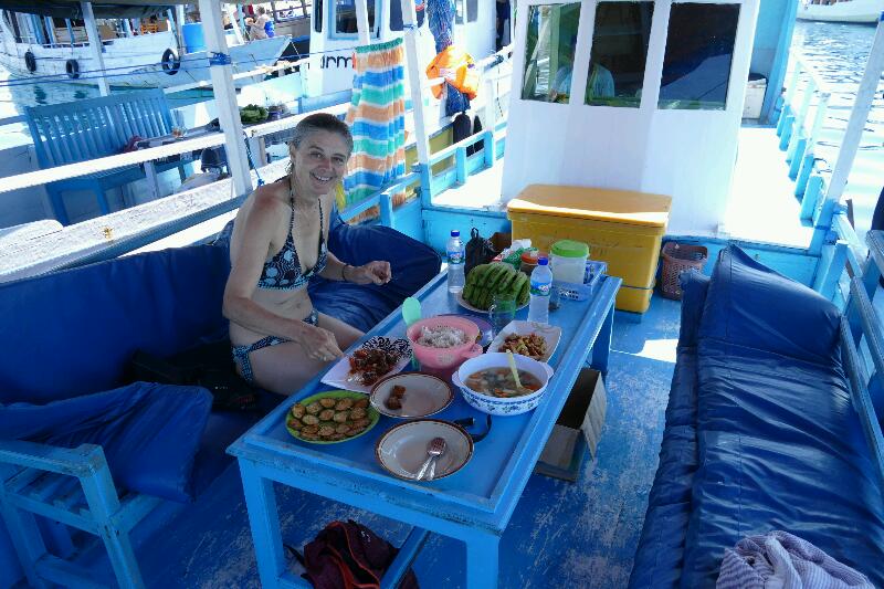 Le déjeuner nous attend sur le bateau après notre plongée. Au moment de prendre une cigarette avec de la pastèque, je suis très étonnée du nombre de cigarettes restant dans mon paquet. Je l’ai acheté juste avant de partir et il en reste seulement 4… J’en fais la remarque à Manu en supposant que l’équipage se sert pendant mon absence mais bon, je n’ai pas de preuve. Juste après le déjeuner servi dès notre retour, le capitaine nous propose de rentrer à Labuan Bajo. Nous trouvons que c’est quand même un peu tôt (nous avions convenu avec l’agence de rentrer entre 17h et 18h) et Manu demande alors de nous conduire à Bidadari. Dans l’eau, en y allant, je me retourne et vois le capitaine prendre une cigarette dans mon paquet. Pris la main dans le sac, il me demande s’il peut la prendre.