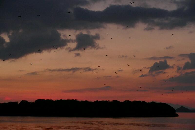 Privés de connexion internet (nous sommes sans doute trop loin d’une antenne), nous profitons de la soirée pour trier nos photos. Reste à vivre un moment unique à la tombée de la nuit, depuis le mouillage que nous avons fait devant une île couverte de mangrove : le départ de dizaines de milliers de mégachiroptères/roussettes (chauves-souris géantes) qui quittent leurs perchoirs à l’envers et s’envolent vers Florès afin de festoyer. Ces animaux se nourrissent uniquement de fruits ! Nous arrivons à tenir l’équipage éveillé jusqu’à 21h00.