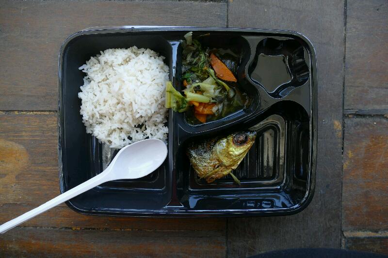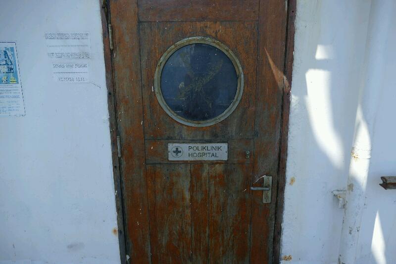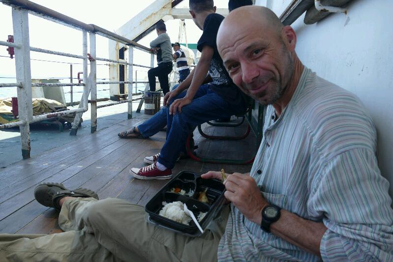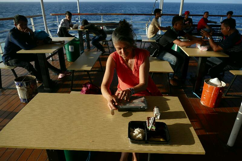Dès qu’une place se libère sur un banc, je me dépêche de la squatter le temps d’écrire un peu quelques pages de ce carnet. Mais je suis obligée d’alterner en allant faire quelques pas car j’ai mal au dos sur ces bancs inconfortables. Lors de notre passage dans les dortoirs, un indonésien (40 ans paraîssant 15 de moins) a tenté de nous expliquer que deux couchettes se libèreront lors du prochain arrêt, dans 6 heures. Il nous retrouvera quelque temps après, sur le pont pour converser avec Manu. Ceci dit, il nous explique le principe des repas : nous avons le droit à 3 repas avec notre ticket (7h : petit déj, 11h : lunch, 17h : dinner). Il faut prêter attention aux annonce sonores en indonésien. Il nous incite aussi à payer un peu plus cher mais à prendre une cabine. Manu va se renseigner (toujours accompagné de ce jeune homme) mais une chambre nous coûterait 1 million (soit 65 euros). L’annonce pour le lunch ayant eu lieu pendant cette escapade, Manu me rapporte un plateau repas, composé de riz, de quelques légumes sans goût et d’une tête de poisson. Franchement peu appétissant et vraiment pas bon. En chemin, il a croisé un rat et plusieurs cafards. Deux indonésiens squattant le banc près de nous (qui sommes par terre) avec leurs bagages nous offrent une saucisse de poulet chacun (je ne trouve pas ça bon du tout, Manu dit que cela a un goût de quenelle…).
