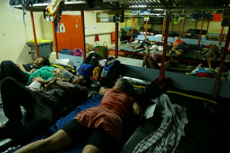 Sur le bateau, qui contient quand même plusieurs centaines de personnes, nous sommes les seuls touristes. La connexion en avion était beaucoup trop chère alors nous entreprenons un long voyage puisque nous n’arriverons que demain midi, soit 28 heures pour rejoindre Labuan Bajo à Makassar. Il y a trois ponts réservés à la classe économique. Nous tentons de trouver deux couchettes parmi ces dortoirs remplis d’indonésiens, en vain. Nous nous trouvons une place par terre sur un pont à l’extérieur.
