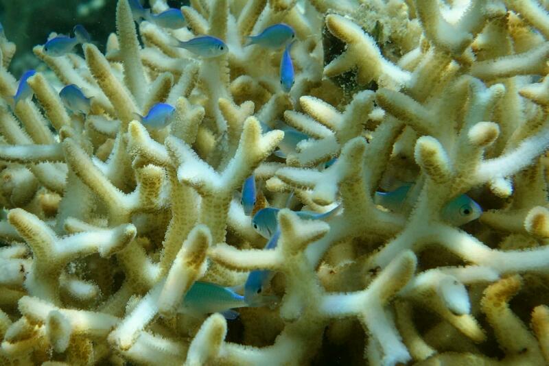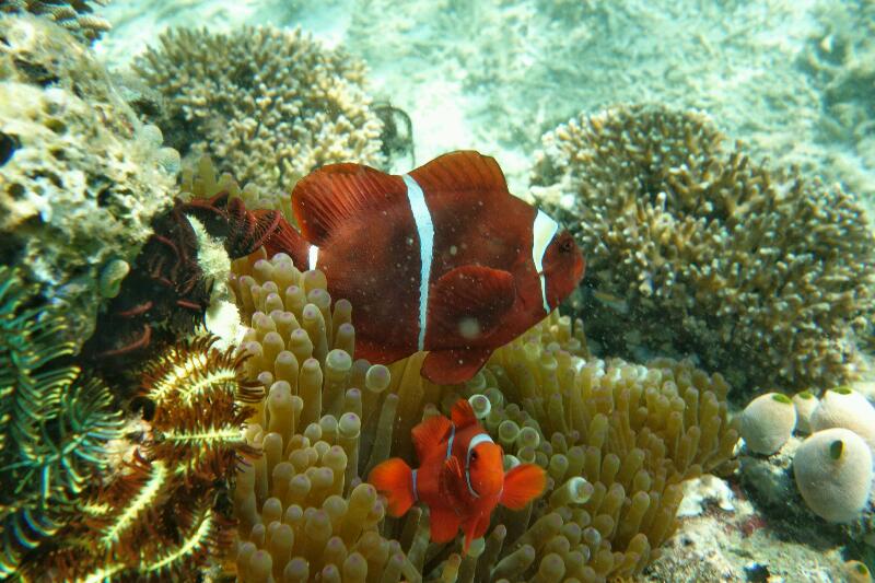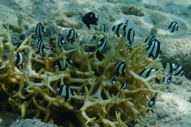 Levés à 6h30, nous partons dès nos bananes frites avalées et nous nous voyons proposer une plongée à 7h00 du matin… Nous affrontons la douleur ressentie par nos coups de soleil en enfilant nos combinaisons avant d’aller voir les petits poissons. Ce n’est pas un hasard si j’écris « petits ». C’est comme si on était dans une crèche. On y voit des centaines de tous petits exemplaires de nos poissons habituels, souvent gardés par quelques spécimens adultes devant les coraux où ils sont nés qui n’hésitent pas à nous intimider en nous regardant bien droit, certains même allant même jusqu’à tenter d’attaquer l’objectif de l’appareil photo ou à piquer le bras de Manu.