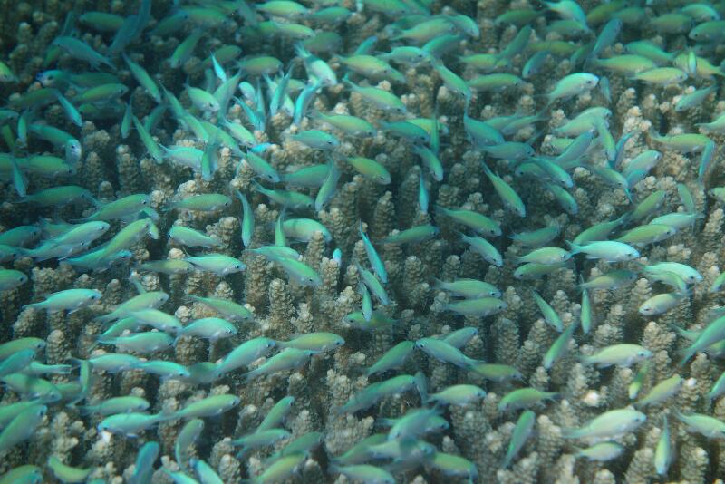 La grande raison de venir à Labuan Bajo, l'unique raison même, c'est donc la qualité des fonds sous-marins. Et à la question: "finalement, cela en vaut-il la peine ?", nous ne pouvons malheureusement pas donner de réponse faute d'expérince de durée suffisante. Les quatre ou cinq snorkelings que nous avons faits, dans de bonnes conditions de soleil et de clapot, étaient beaux, pas forcément très spectaculaires mais vraiment très élégants, avec en particulier une excellente combinaison de coraux mous et durs et une bonne variété de petits poissons. Pour autant, ce n'était nullement supérieur à Embudu ou même à Dahab (on va dire que la supériorité du corail est compensée par l'infériorité en termes de poissons). La seule raie manta que nous avons vue, perdue dans le bleu au mileu d'autres bateaux, ne valait quant à elle pas le déplacement. Nous avons aperçu une tortue, une ou deux raies aigles, mais il s'agissait de visions fugaces. Dans l'ensemble nous ne pouvons guère tirer de conclusion définitive. Il aurait peut-être fallu aller aussi sur des sites de plongée dérivante, mais cela nécessite de passer par des clubs de plongée, ou d'être plus spécifique dans les demandes à faire lors de la privatisation du bateau.