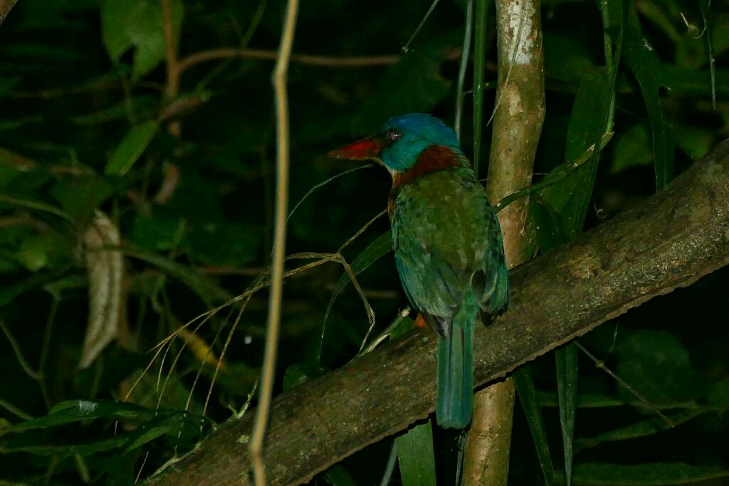 Il s’agit de prendre une mikrolet jusqu’à la gare routière. En attendant le départ du car qui nous conduira à Bitung, Manu court augmenter notre crédit de téléphone et retirer de l’argent. A l’arrivée, nous prenons de nouveau une mikrolet jusqu’à Tangkoko. La dernière partie de la route m’est assez pénible. Nous posons nos affaires à l’hôtel « Tarsius », prenons un thé avant de partir pour l’excursion du soir dans la jungle. Nous faisons la connaissance d’Alain et Lydie et de leur ami Serge (de Toulouse). Conformément aux recommandations, nous nous badigeonnons d’anti-moustiques, enfilons pantalons, chaussettes et liquettes nous couvrant les bras. Nous suivons notre guide June qui nous montre quelques oiseaux dont un beau martin-pêcheur avant de nous conduire à l’arbre à tarsiers.