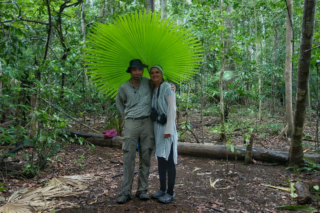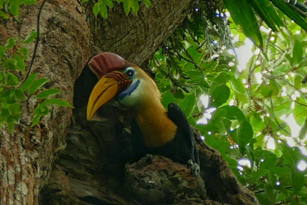 June nous mène à l’arbre à Calao. Nous y voyons un nid au sommet. Le guide nous demande de patienter car le mâle fait régulièrement des allers-retours pour nourrir ses petits. Il pleut de plus en plus, tant est si bien que nous nous abritons sous de grandes feuilles de bananiers qui jouent parfaitement leur rôle de parapluie. Nous voyons effectivement le calao venir donner la becquée à deux reprises.