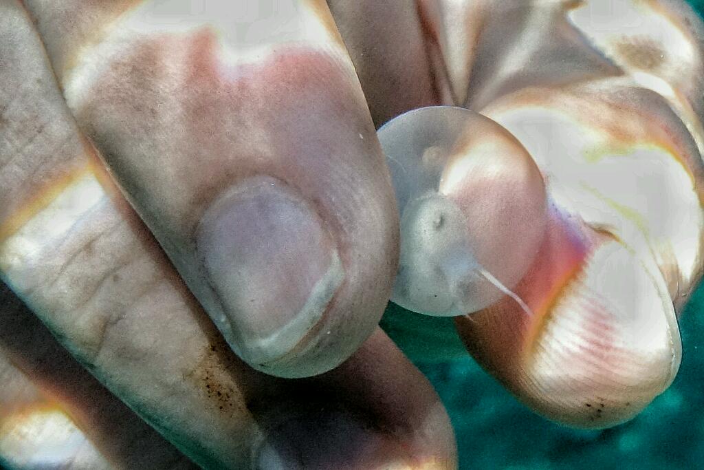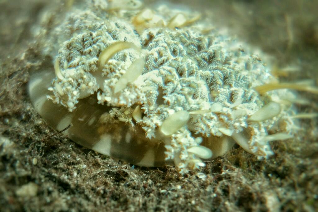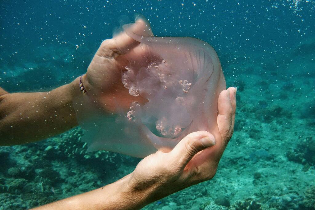 Puis les garçons vont faire une sieste dans les hamacs. Yoann revient pour nous faire découvrir les alentours du bungalow, c’est-à-dire la mangrove. Nous y voyons des choses inhabituelles : un gros nudibranche (notre premier), une sorte de méduse …