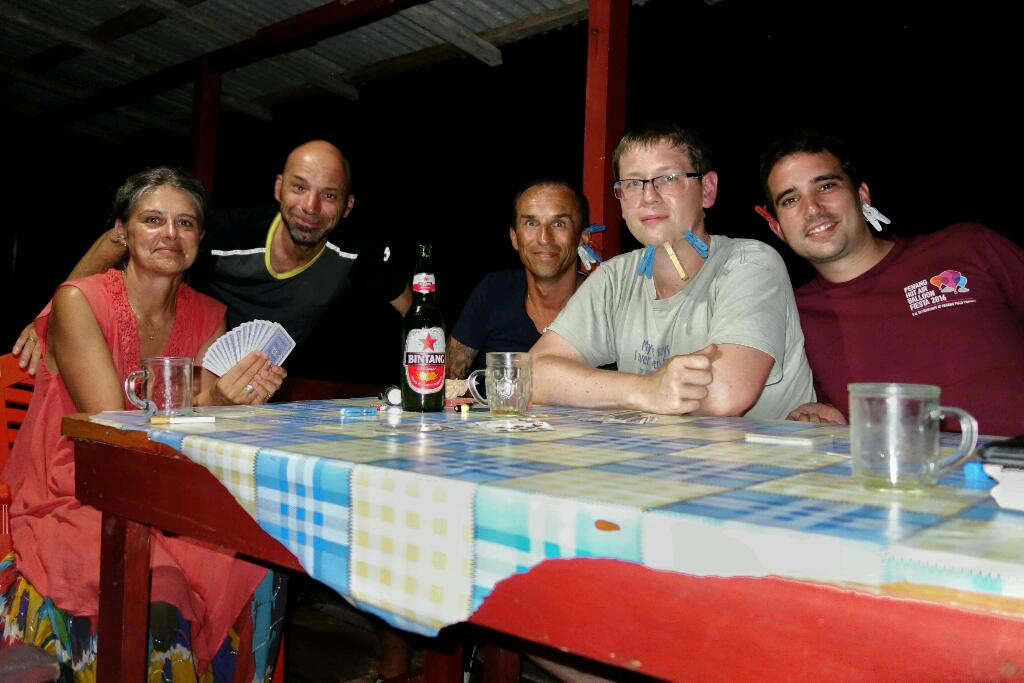 A notre retour, le nouvel arrivant est là : Christophe (34 ans, travaillant à la Matmut et habitant Carquefou). Il arrive d’Inde. Il voyage deux mois, sans son amie qui trouve les conditions de confort insuffisantes. Après le dîner, nous proposons aux autres de jouer aux cartes mais avant, je file faire pipi. Il n’y a pas beaucoup de lumière dans « la salle de bain » aussi, je me demande ce qu’il y a près des toilettes : un serpent de mer !!! J’appelle les garçons mais on ne sait pas trop comment s’en débarrasser. Ce qui est sûr, c’est que je refuse de dormir avec. Avec une palme, nous parvenons à le réveiller et il bouge un peu. Il essaie même de grimper contre le mur mais on le dévie de sa trajectoire dans l’espoir de le faire passer sous la cloison pour le reconduire à la mer mais il ne réapparaît pas de l’autre côté, il est retourné à l’eau entre deux planches de bois qui constituent le sol, par où il était sans doute venu. Rassurés, nous repartons initier les garçons à la partie de cartes indonésiennes avec les pinces à linges. De nombreuses Bintang sont vidées pendant la partie …