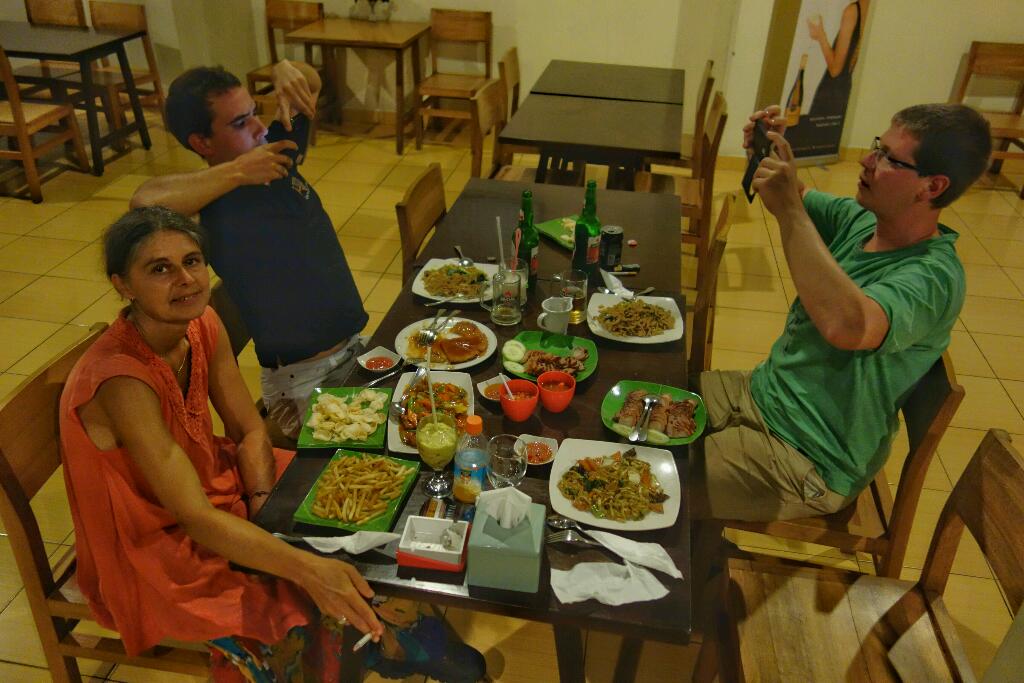 Une fois installés à l’hôtel Happy flower, à Tomohon, nous allons dîner. Nous sommes tellement impressionnés du festin qui nous est servi que chacun prend la table en photo.