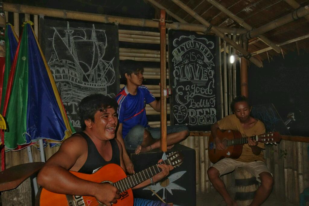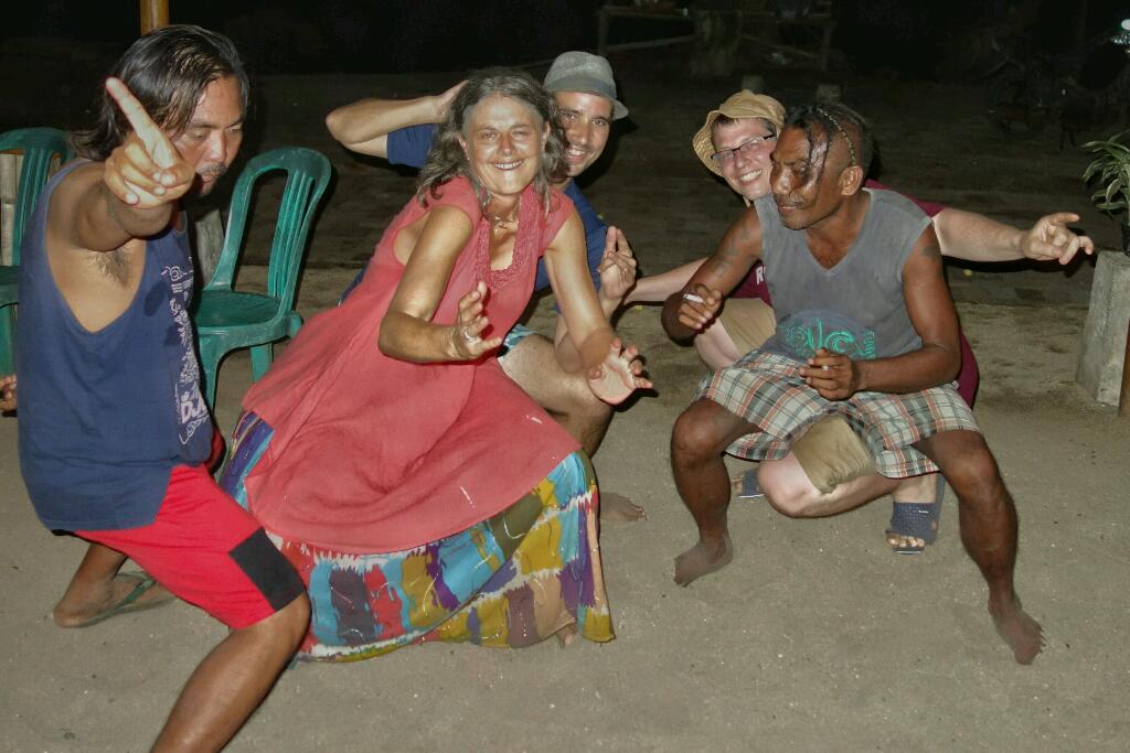 Après le dîner, Hody nous propose de le suivre dans un bar un peu plus loin car ses copains et lui vont jouer de la musique pour Amory. L’orchestre se compose d’une guitare et d’une contrebasse fabriquée localement : une caisse de bois percée munie d’un long manche et d’une seule corde. L’effet rendu est impressionnant. Nous passons une bonne soirée à chanter, danser, rire et boire un peu. Le principe est toujours le même : le plus jeune de l’assemblée verse (très) régulièrement dans un verre commun 2 à 3 cm de boisson composée de 2 Bintang diluées dans du jus de fruits contenue dans un pichet. Le but est de vider le verre avant de le lui rendre pour qu’il le remplisse à nouveau pour le voisin. La première tournée est payée par les indonésiens, la deuxième par nous, la 3ème par les garçons et il faut un peu se fâcher à la fin car les indonésiens poussent, il fallait s’en douter, à la consommation. Ce breuvage qui est très doux pour nous fait beaucoup d’effet sur les locaux qui porteraient, parait-il, un gène les saoûlant très vite même à petite dose de consommation d’alcool. Une fois couchés, j’entends les garçons qui prolongent la soirée sur la plage avec Hody après être allés chercher des bières au village.