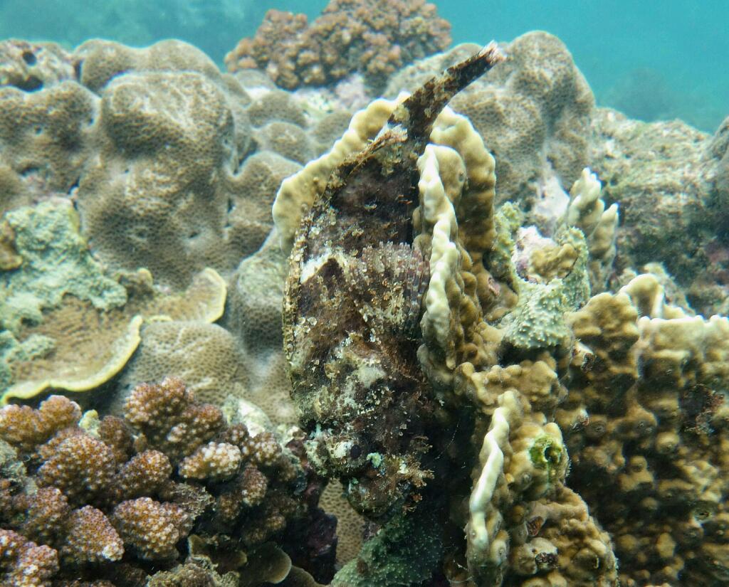 Après le déjeuner, bien que Manu souffre toujours de son oreille, nous allons faire notre dernier snorkeling à Bunaken et nous ne regrettons pas l’effort que cela a pu lui coûter. Nous réussissons à voir, entre autres, un poisson pierre, l'un des rares dangers potentiellement mortels de cette zone, à quelques dizaines de mètres de notre guesthouse.