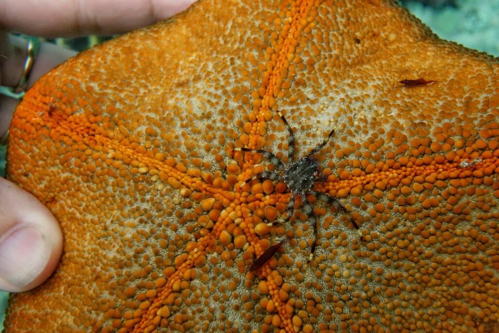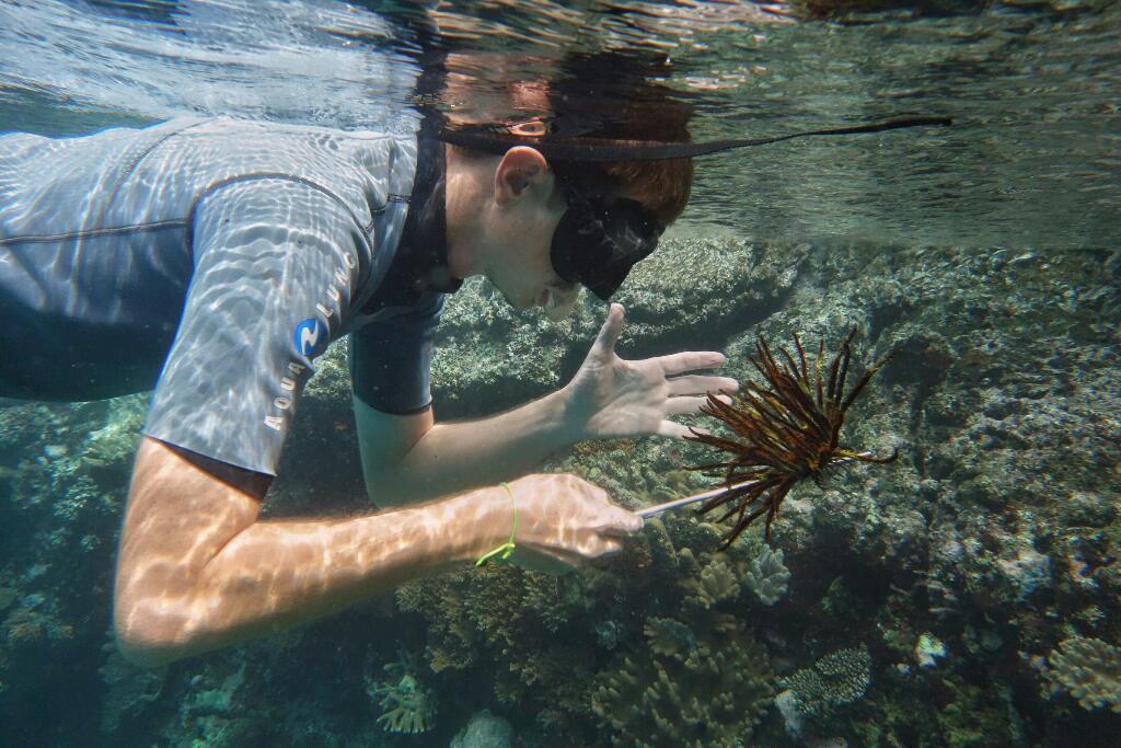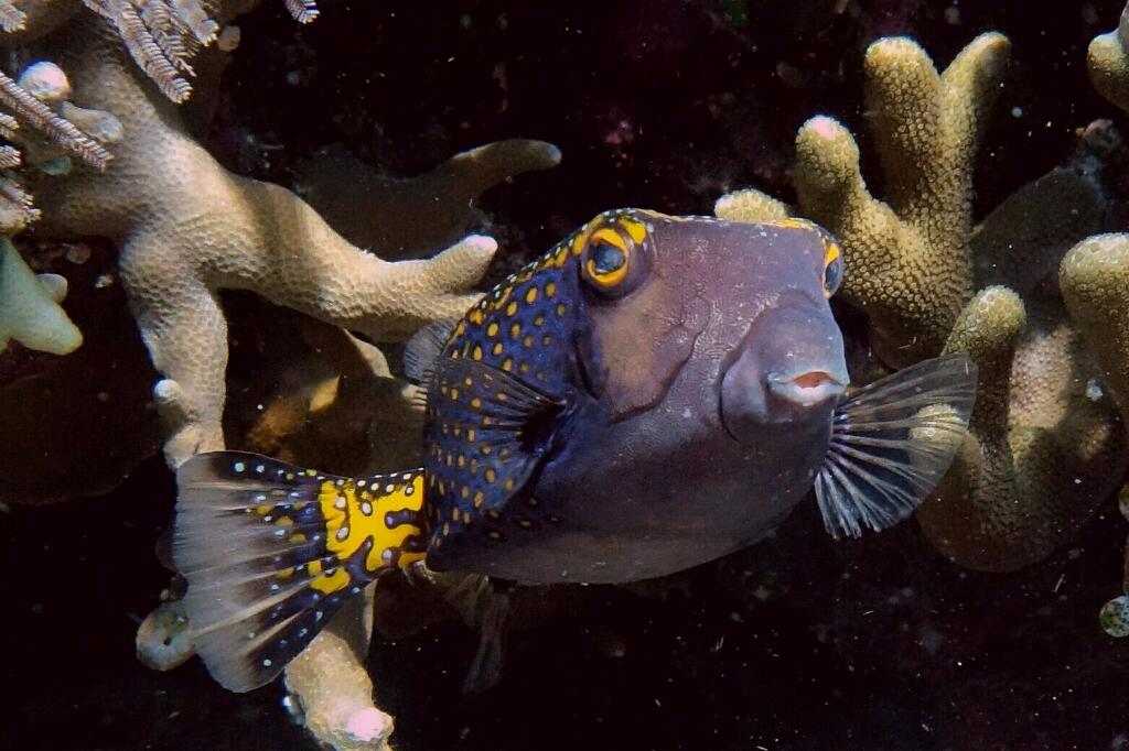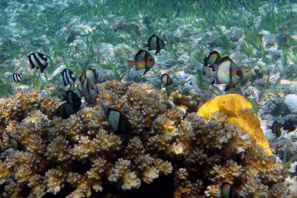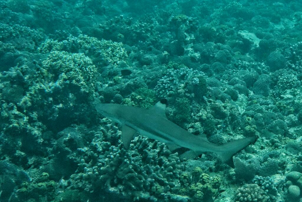 Yoann arrive à 7h00 avec le petit déjeuner et à peine une heure plus tard, nous partons en bateau. Il nous emmène à un endroit où, quelques jours avant notre arrivée, il avait vu 30 requins. Nous n’en dénombrerons qu’une douzaine et ils sont de petite taille. Il y a beaucoup de vagues à cet endroit, ce que je ne trouve pas très agréable. Pour la première fois, j’ai presque le mal de mer en snorkelant mais quelle plongée : une rascasse, des méduses non venimeuses, une murène, notre première étoile coussin avec ses crevettes.