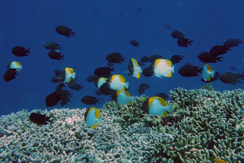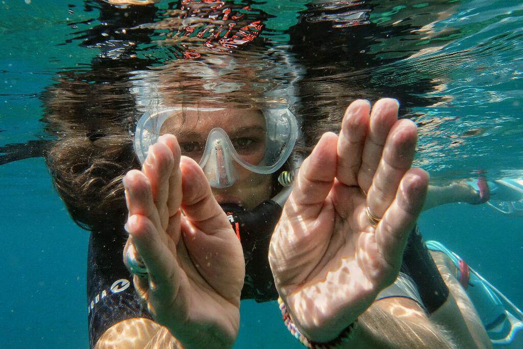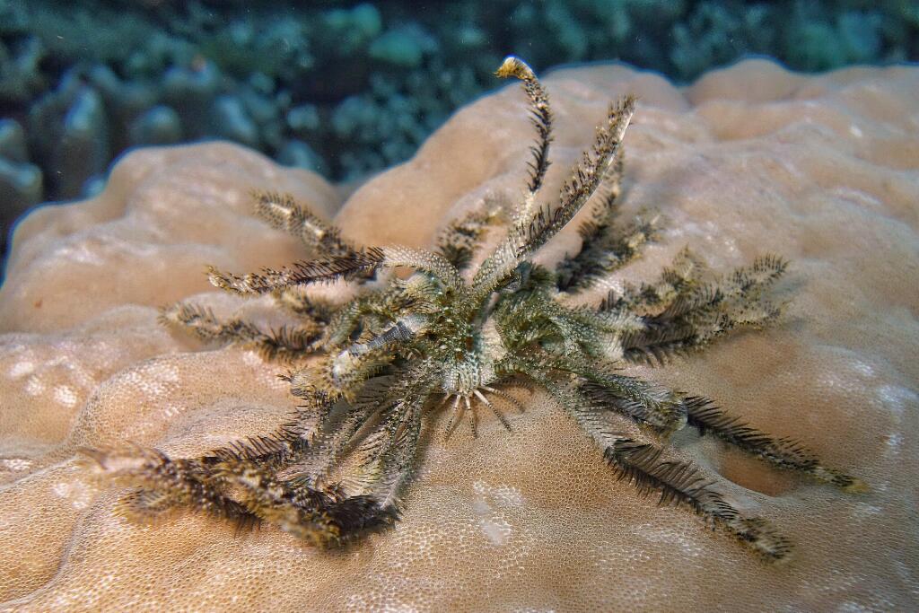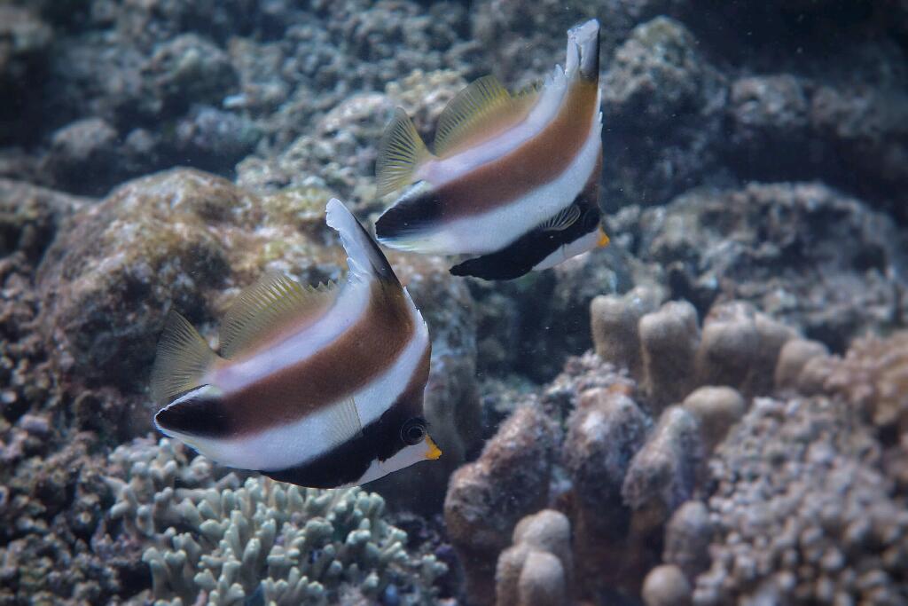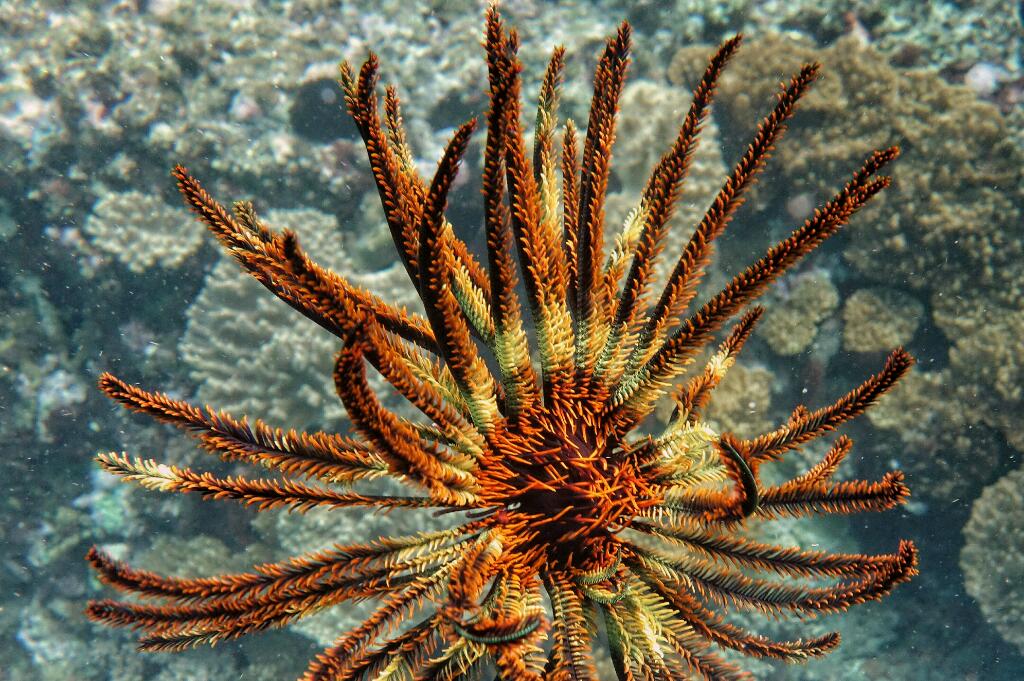 Yoann arrive à 7h00 avec le petit déjeuner et à peine une heure plus tard, nous partons en bateau. Il nous emmène à un endroit où, quelques jours avant notre arrivée, il avait vu 30 requins. Nous n’en dénombrerons qu’une douzaine et ils sont de petite taille. Il y a beaucoup de vagues à cet endroit, ce que je ne trouve pas très agréable. Pour la première fois, j’ai presque le mal de mer en snorkelant mais quelle plongée : une rascasse, des méduses non venimeuses, une murène, notre première étoile coussin avec ses crevettes.