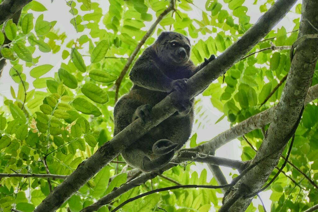 Debouts à 5h15, nous prenons le chemin du parc à 6h00, sous un ciel couvert. Nous croisons un couscous sur une branche. Il n’est pas loin mais l’heure matinale et le mauvais temps nous le font découvrir dans de mauvaises conditions de lumière.