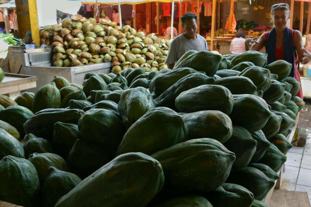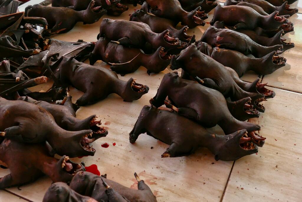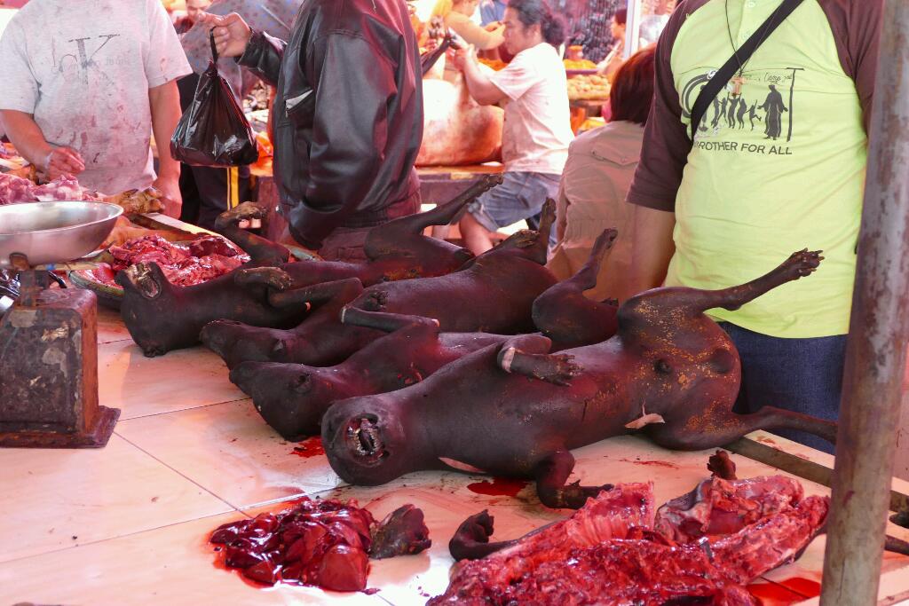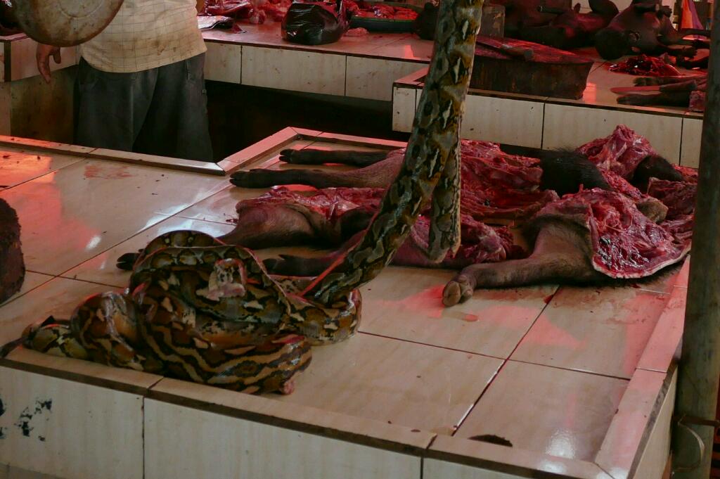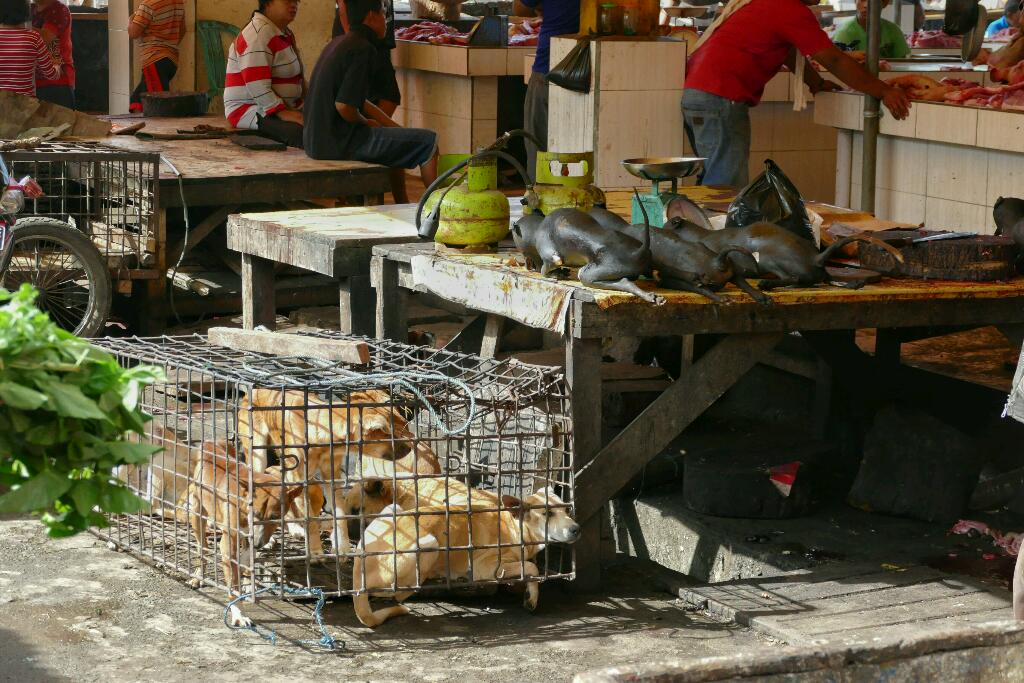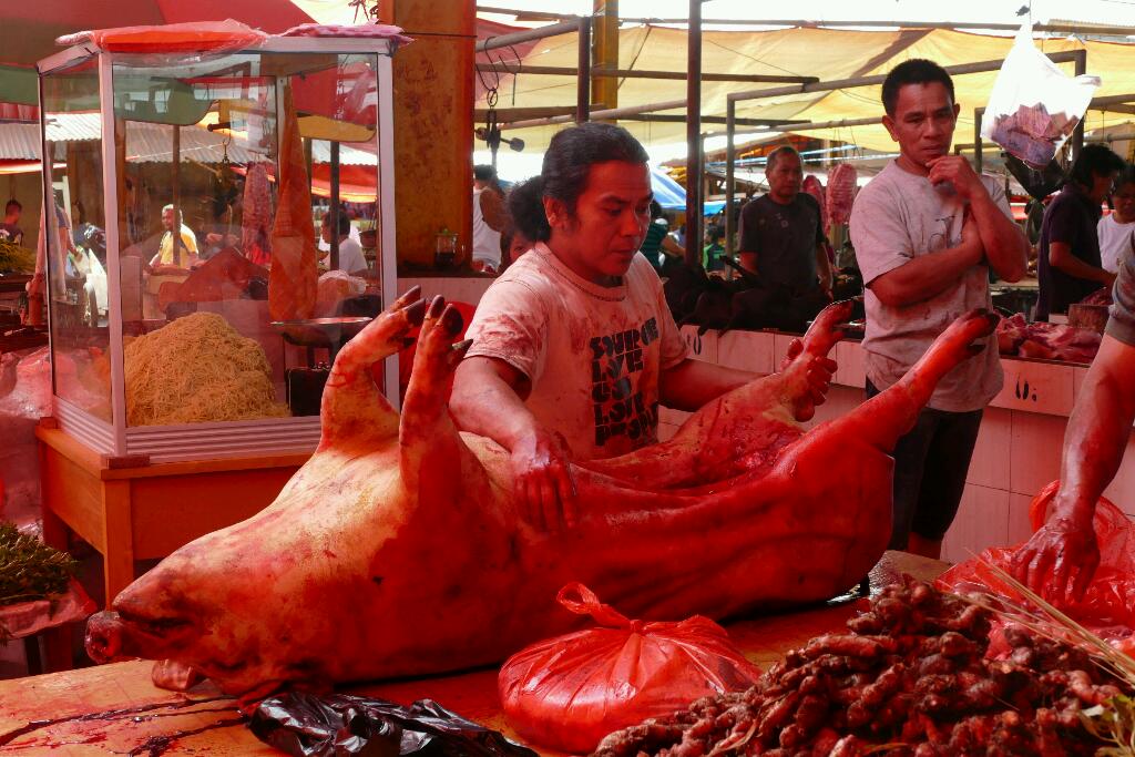 Nous commençons par la visite du marché de Tomohon. On nous l’avait décrit comme étant particulièrement gore mais ce n’est pas notre ressenti. On traverse les étalages de fruits et légumes avant d’arriver au rayon boucherie. L’odeur y est bien plus supportable que dans d’autres marchés. On a sans doute fait le bon choix en choisissant d’y aller le matin. On y voit des cochons, blancs ou noirs, en train de se faire vider ou découper avant d’arriver aux chauve-souris et aux chiens. Le client peut choisir le chien de son choix dans une cage. Il sera ensuite tué et brûlé par le vendeur. Le plus difficile, c’est d’entendre les chiens hurler car ils comprennent manifestement ce qui risque de leur arriver. On peut aussi acheter du serpent pour le cuisiner.
