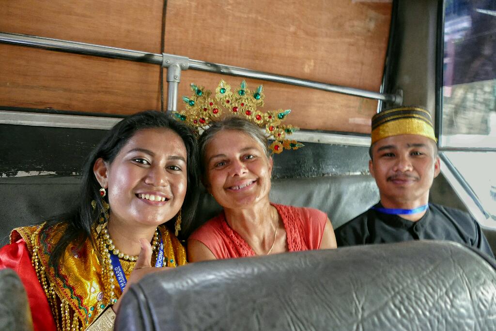 Après nous être mêlés séparément à l’immense foule qui remplit le stade (Raphaël se faisant photographier près de miss Manado), nous nous séparons. Les garçons partent avant la cérémonie religieuse. Nous restons jusqu’à ce que nous déclarions forfait car nous ne comprenons pas grand-chose à la grande messe qui s’annonce très longue. Nous marchons un bon moment, achetons des brochettes au passage à un vendeur de rue et attrapons une mikrolet qui nous avance un peu dans ce long trajet de retour jusqu’à notre hôtel. Nous venons d’assister à une soirée riche en couleur !