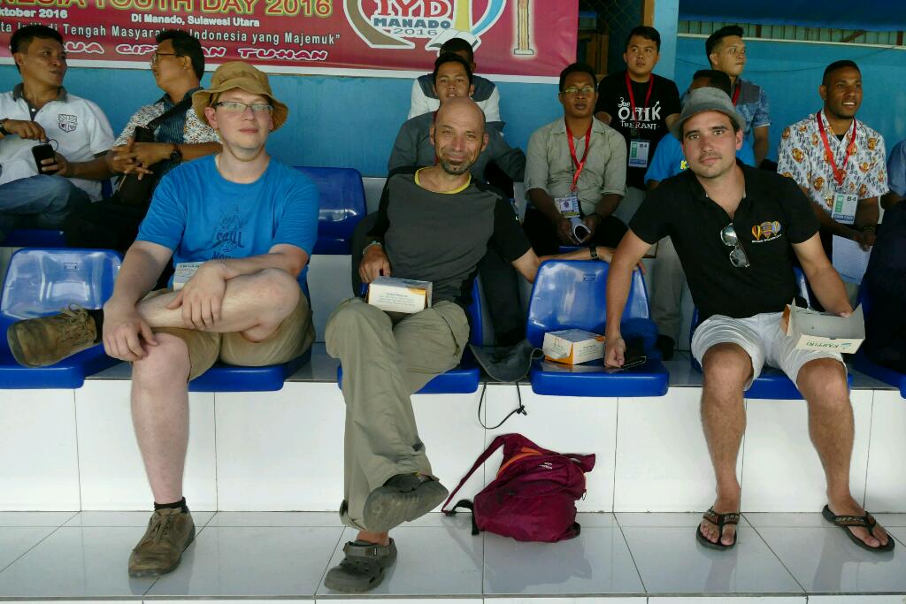 Une fois nos affaires déposées à Istanaku (le même hôtel que lors de notre précédent passage à Manado), nous reprenons la voiture en direction du stade en faisant un stop au magasin de plongée. Manu décide de ne pas racheter de palmes pour le moment. De gros embouteillages nous obligent à descendre de la voiture. Nous avançons un peu à pied avant d’accepter de monter dans un bus rempli de jeunes indonésiens vêtus de costumes traditionnels qui se rendent à la 2ème journée indonésienne de la jeunesse. Cet événement à caractère national est organisé par la Conférence épiscopale sur le modèle des Journées mondiales de la Jeunesse.