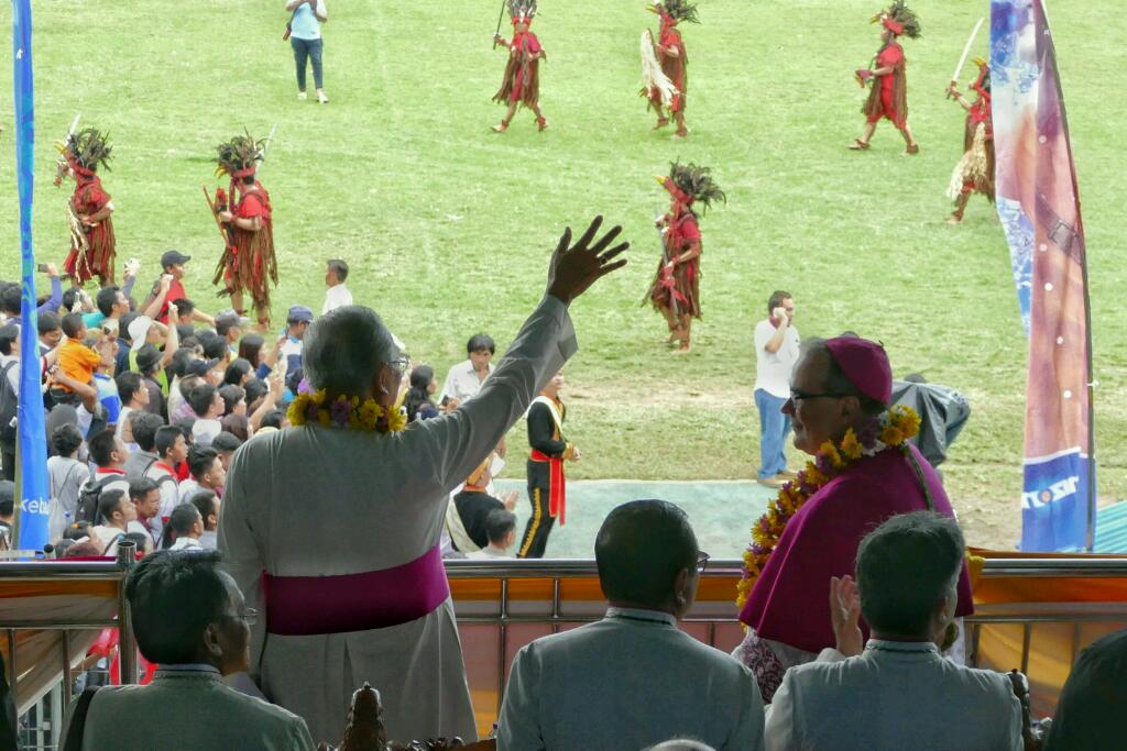 Nous nous rapprochons d’une entrée et nous interrogeons un des chevaliers servants de miss Manado et ses dauphines sur la possibilité d’assister à cet événement. A notre grande surprise, après avoir demandé l’autorisation aux personnes requises, on nous conduit … dans la tribune des officiels. Nous nous retrouvons donc juste derrière le nonce apostolique Mgr Antonio Guido Filipazzi.