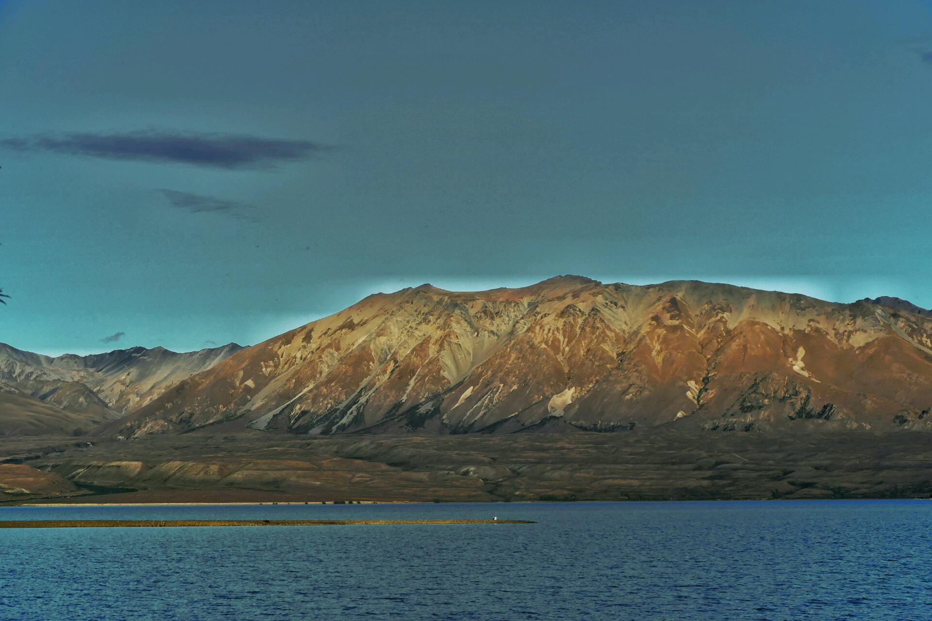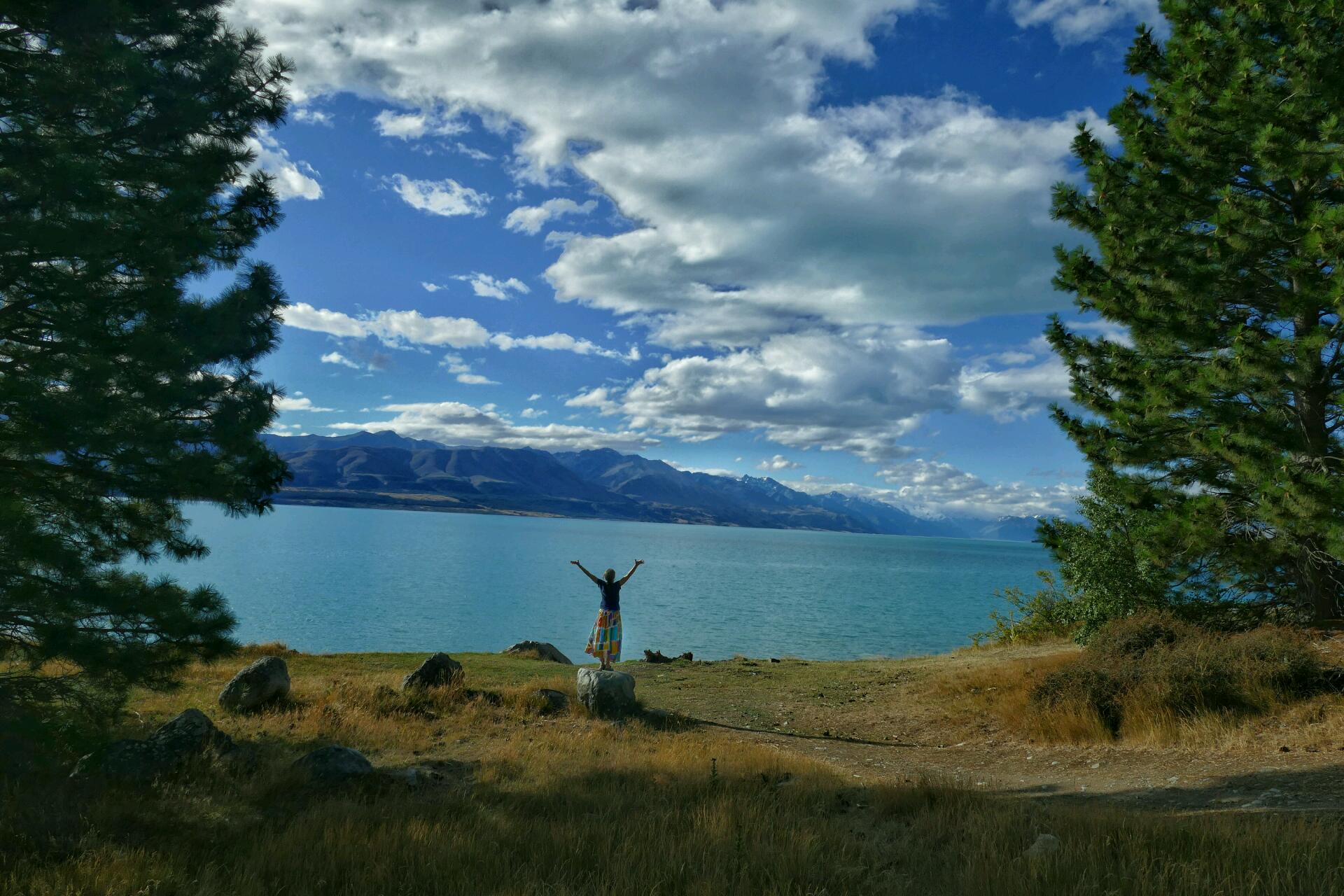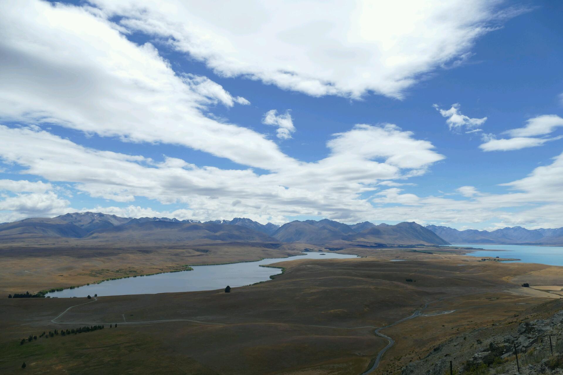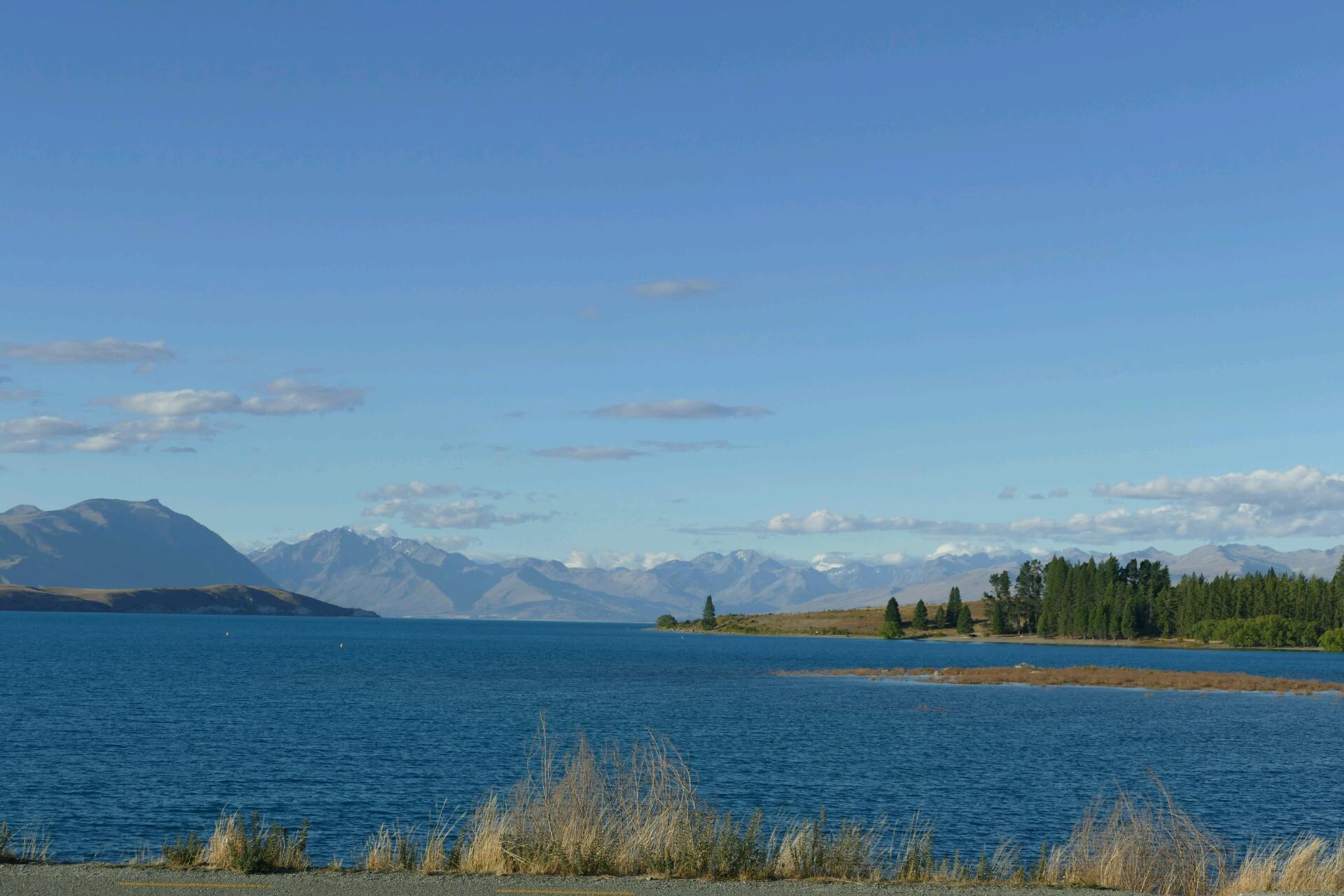 Les collines se succèdent les unes aux autres, la route est en parfait état, et nous ne croisons aucune maison sur des dizaines de kilomètres. La Nouvelle-Zélande nous apparaît alors dans toute sa splendeur : je ne cesse de répéter que je trouve cela magnifique. Nous arrivons au lac Tekapo en fin d’après-midi. Ce lac situé dans la région des Mackenzie est le plus haut de Nouvelle-Zélande (710m). Le lac Tekapo a une couleur d’un bleu particulier ressemblant à un mélange de bleu et de blanc. Ceci est dû à la « farine de pierres » : des particules minérales provenant de l'érosion de la montagne par des glaciers qui alimente le plan d'eau. Ces sédiments donnent l’aspect laiteux au lac et empêchent les rayons du soleil de traverser le lac, d’où une couleur satinée et opaque.