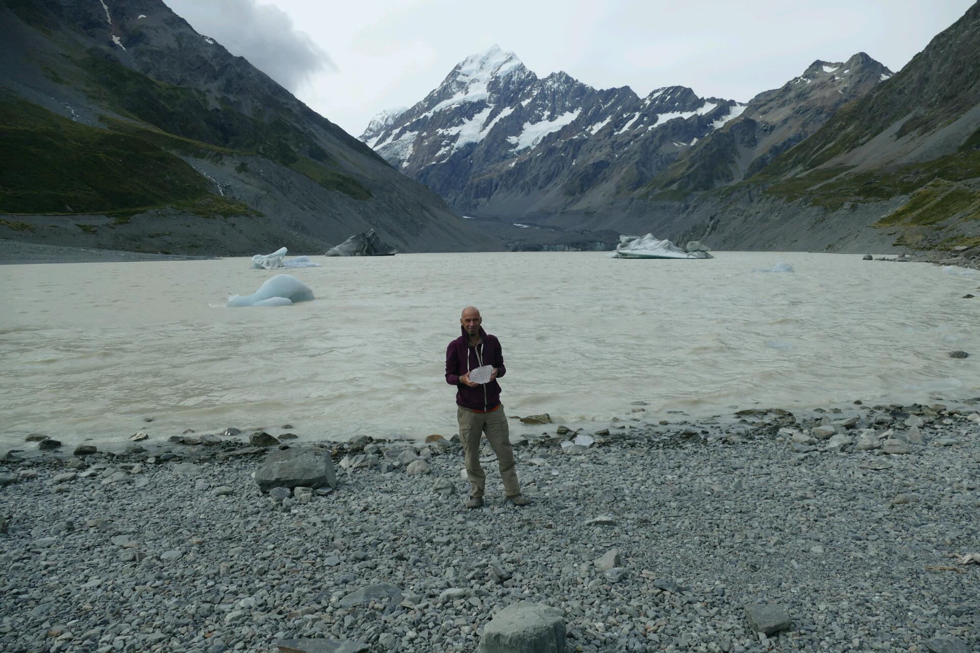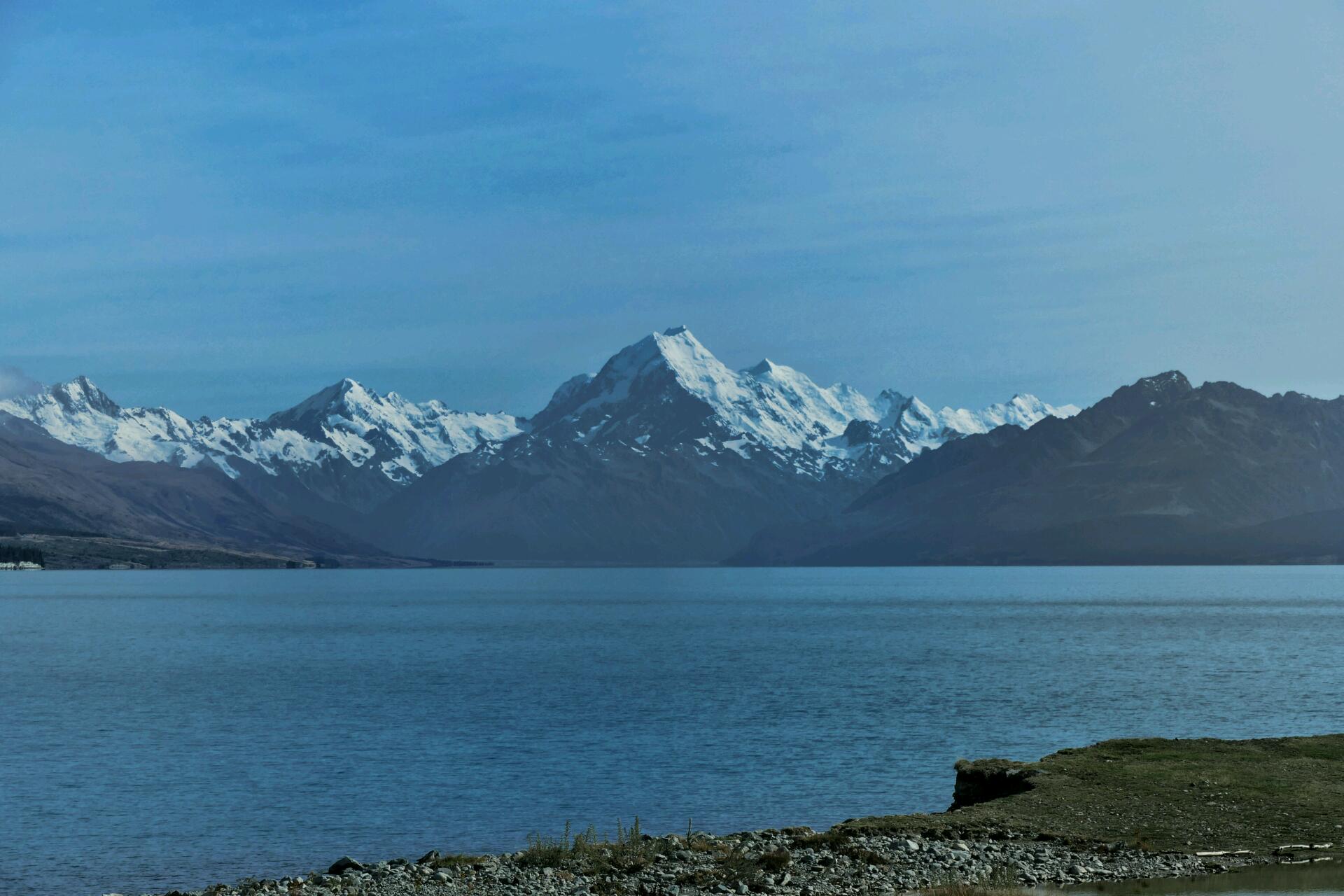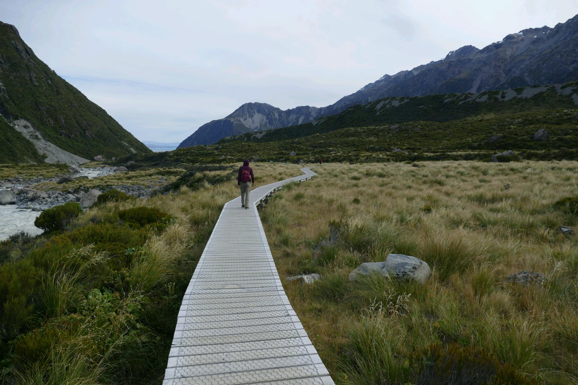 Peu de temps après, le mont Cook commence a apparaître sur la route. Le Mt Cook (les Occidentaux l’ont baptisé ainsi en l'honneur du célèbre explorateur Anglais) est le mont le plus élevé de Nouvelle Zélande, et culmine à 3724 mètres. Autour de ce dernier s’est développé une petite activité, qui compte un visitor center, quelques cottages et un camping. Le tout est géré par le DOC (Department of Conservation), on ne trouve donc aucun commerce sur place si ce n’est une station essence. La raison d’un tel essor autour du Mt Cook est dû au fait que plusieurs marches intéressantes sont présentes dans la zone. En effet, on trouve des marches pour tous les niveaux et de toutes les durées, de quelques minutes sur terrain plat à plusieurs jours de réelle ascension montagneuse.