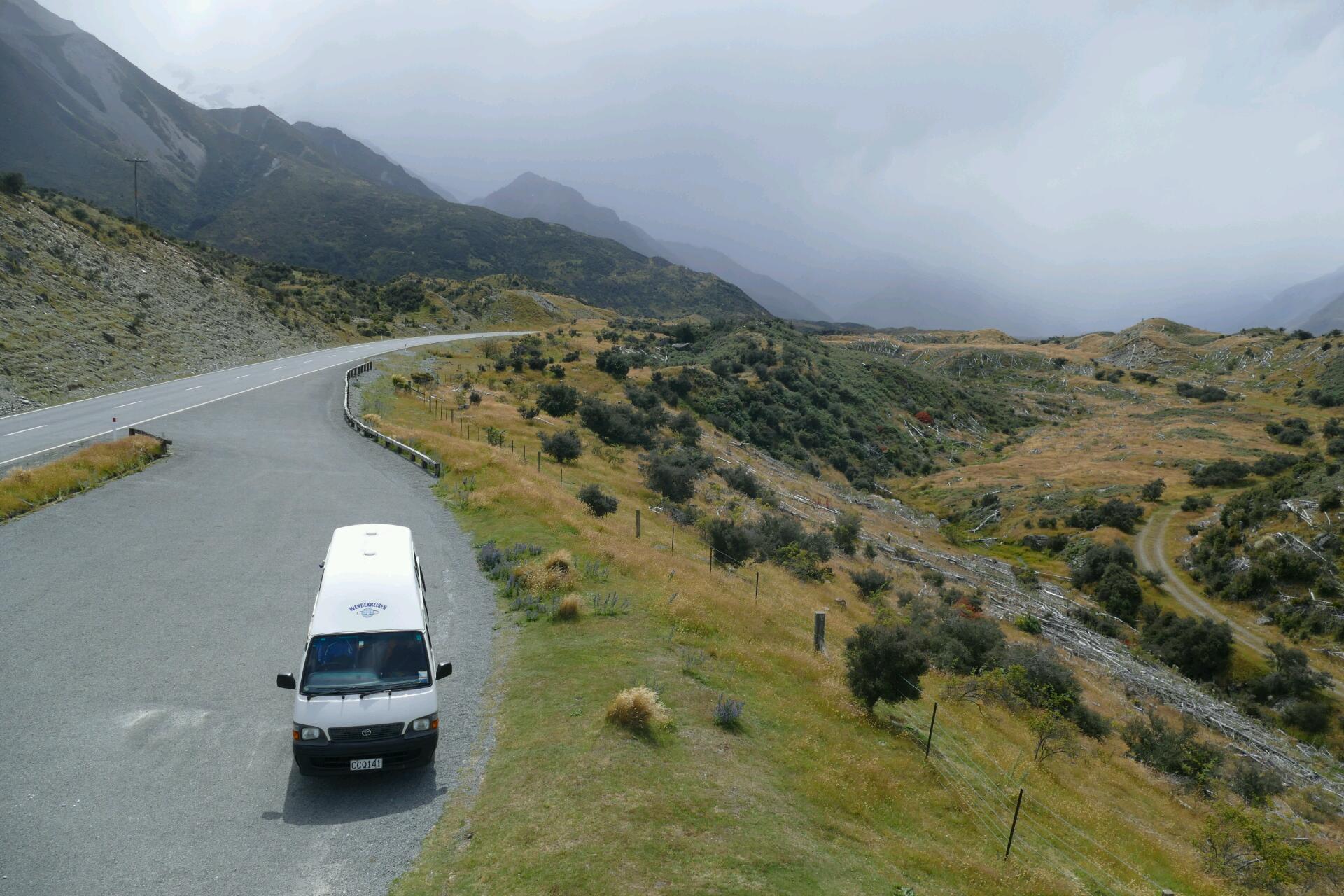 Pour nous, la Nouvelle-Zélande a aussi été l'occasion (importante) de tester un mode de transport qui pourrait nous concerner davantage à l'avenir, à savoir le véhicule individuel autonome; en l'occurrence un petit campervan (auquel nous n'avons pas trouvé de nom) monté sur un châssis de Toyota Hiace. 453000 km au compteur (nous-mêmes avons roulé 3865 km en 21 jours, et consommé environ 700 grammes de gaz par semaine et une quantité d'essence difficile à évaluer, probablement autour de 350 litres), ce n'était pas une première jeunesse, la boîte de vitesse était parfois rétive, et le jeu de clés fantaisiste (le moteur pouvait continuer de tourner après qu'on ait retiré la clé de contact!); mais nous avons plutôt apprécié l'expérience, et pris bonne note des quelques améliorations utiles permettant de se rapprocher d'un véhicule idéal (davantage de rangements, notamment pour faire sécher la vaisselle, un lit rapide à monter et démonter, une meilleure occultation des vitres, des jauges de réservoir à eau, etc). Nous avons aussi observé de plus près les petits bus réaménagés en véhicules de camping. Un Allemand rencontré au début de notre road-trip nous a même fait visiter le sien, chauffé grâce à un efficace petit poêle à bois. Tout cela nous donne bien entendu des idées pour la suite...