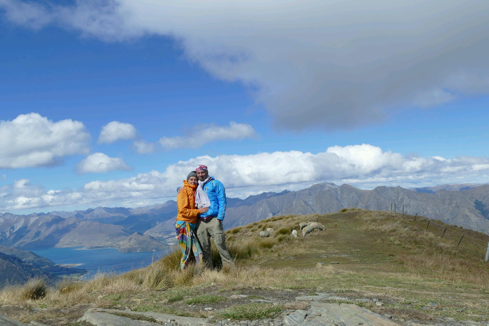 Aujourd’hui : Isthmus Peak Track est une longue marche de 5h30 pendant laquelle nous avons fait un dénivelé de 1080 mètres (l'équivalent de 375 étages de maison), 3h de montée non-stop et 2h de descente pour le retour. Pour être honnête j'ai râlé une partie de la randonnée, surtout quand après 2h de montée on voit un panneau qui nous indique que le mont est encore loin ... Ce trek emprunte par moment des terres privées, où sont élevés en liberté quelques moutons et quelques veaux, il faut donc bien entendu les respecter et bien penser à laisser les portails ou barrières tels qu’on les a trouvés derrière nous. Le pic du mont se trouve au milieu d'une chaîne de montagne donnant une vue à 360° sur deux lacs : le lac Hawea et le lac Wanaka. Je suis tellement contente quand j’arrive en haut et que je découvre découvre la vue ! Manu, arrivé avant moi, m’attendait avec quelques moutons. D’ici, on embrasse le panorama et on s’embrasse de joie !